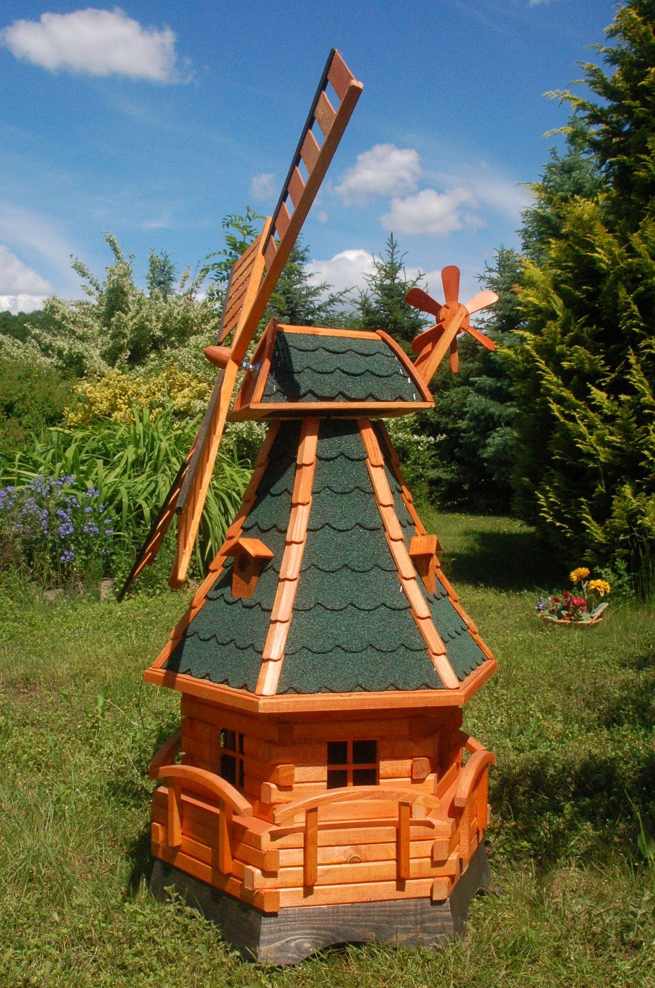 Verschiedene Hölzer kamen bei diesem Modell zum Einsatz und es besitzt eine Verkleidung aus robusten, wasserdichten Bitumenschindeln – farblich könne Sie sich unter dunklen, roten oder grünen Schindeln entscheiden. Der Windmühlenkopf mit dem kleinen Windrad sowie die Flügel sind jeweils um 360° drehbar. Eine der Besonderheit unserer Windmühlen: die Flügel laufen auf einem sehr leichtgängigen, einstellbaren Kugellager.