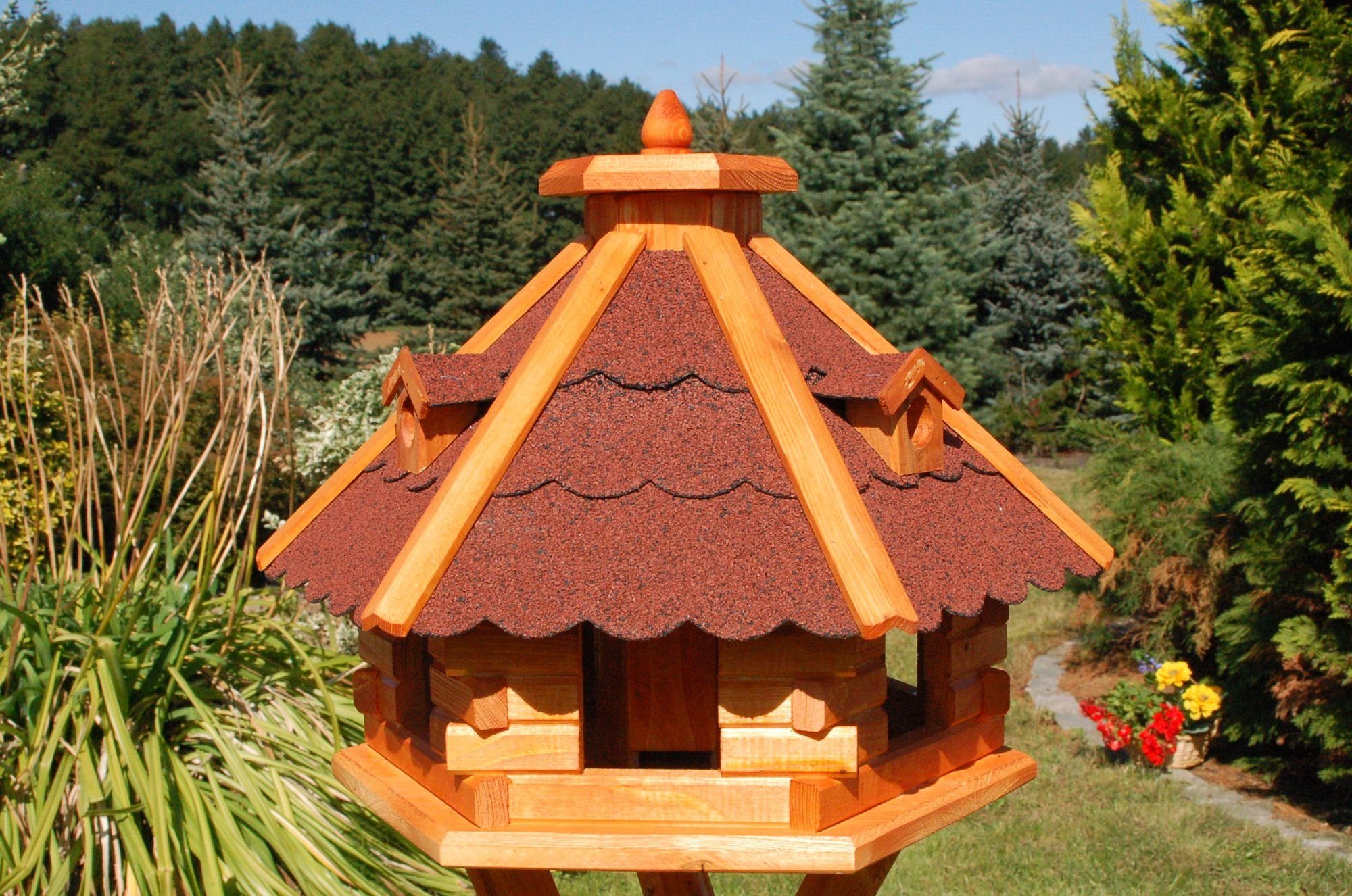 Auf dem Dach dieses Futterhauses befinden sich drei Gauben. Diese verleihen dem Haus sein besonderes Aussehen. Die Dachflächen sind mit roten Bitumenschindeln gedeckt. Das Haus ist 37 cm hoch und hat einen Dachdurchmesser von 56 cm. Die Futterdosierung erfolgt durch den zentral liegenden Schornstein. Das Futter ist dort vor Wettereinflüssen durch den abnehmbaren Schornsteindeckel geschützt. Dieses Haus ist bereits mit Holzschutzmittel behandelt. Ein echtes Schmuckstück für ihren Garten, Terrasse oder Balkon. Geringe Farb- und Detailabweichungen vom Foto sind möglich.