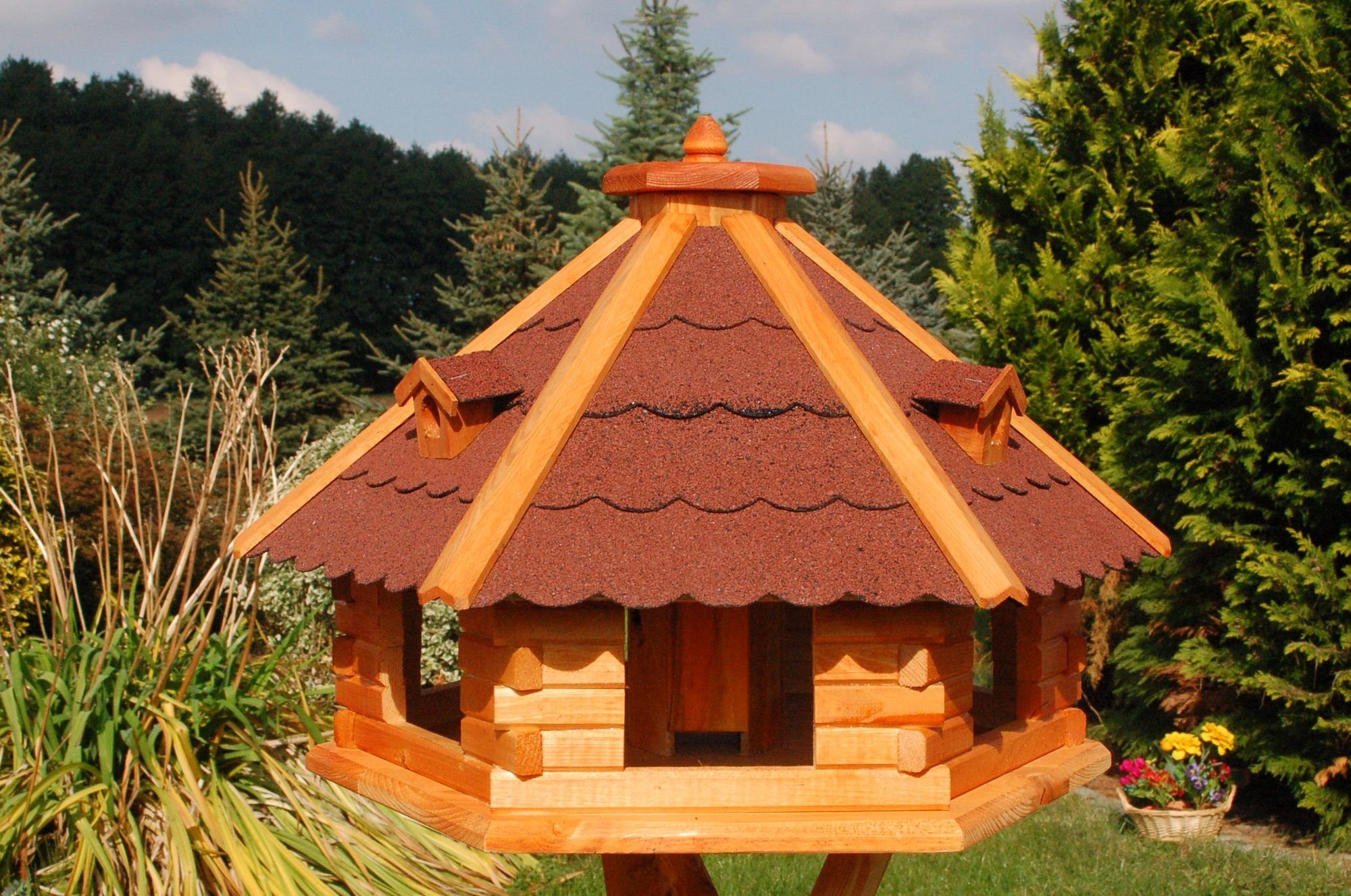 Auf dem Dach dieses Futterhauses befinden sich drei Gauben.