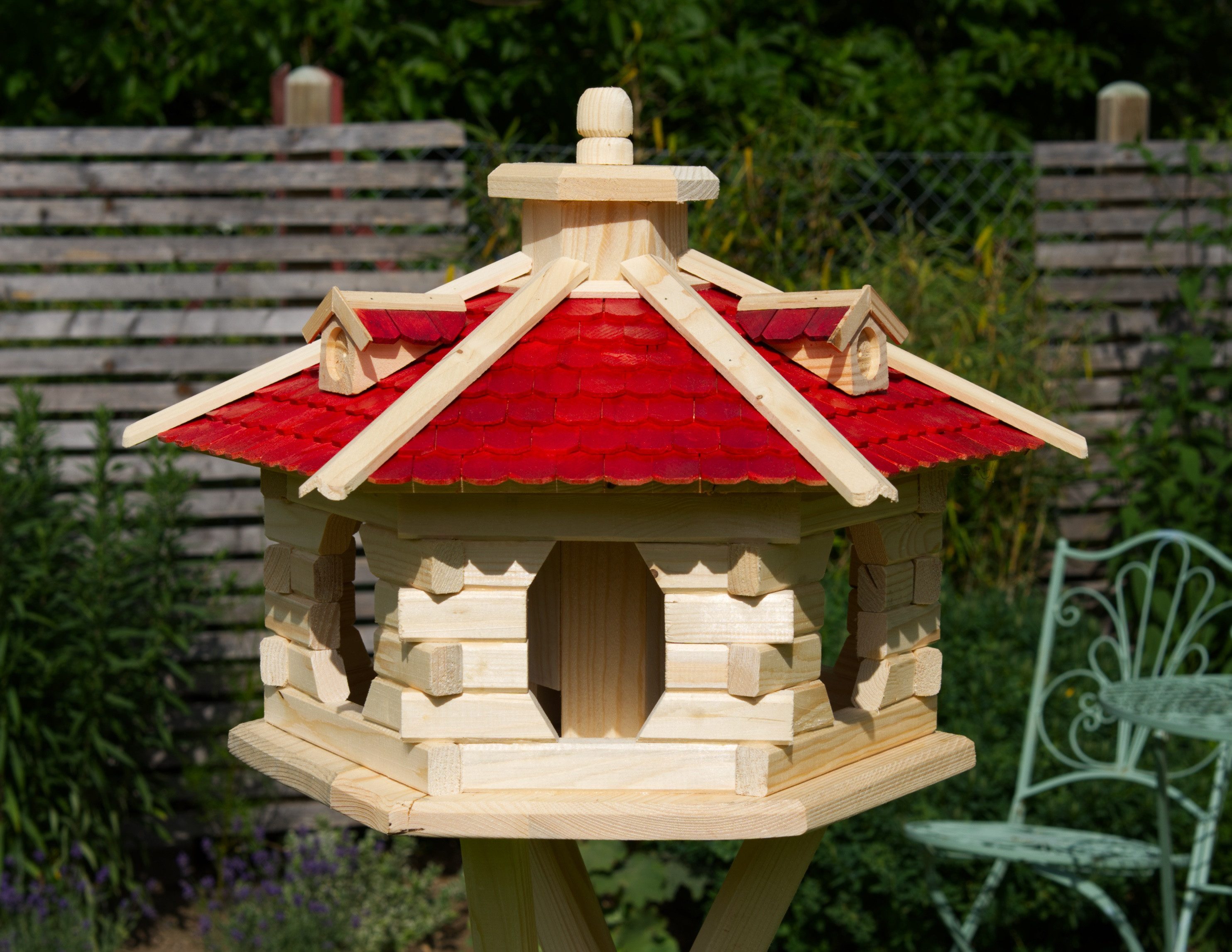 Sechseckiges Vogelhaus aus Holz mit 3 Gauben und Holzschindeldach