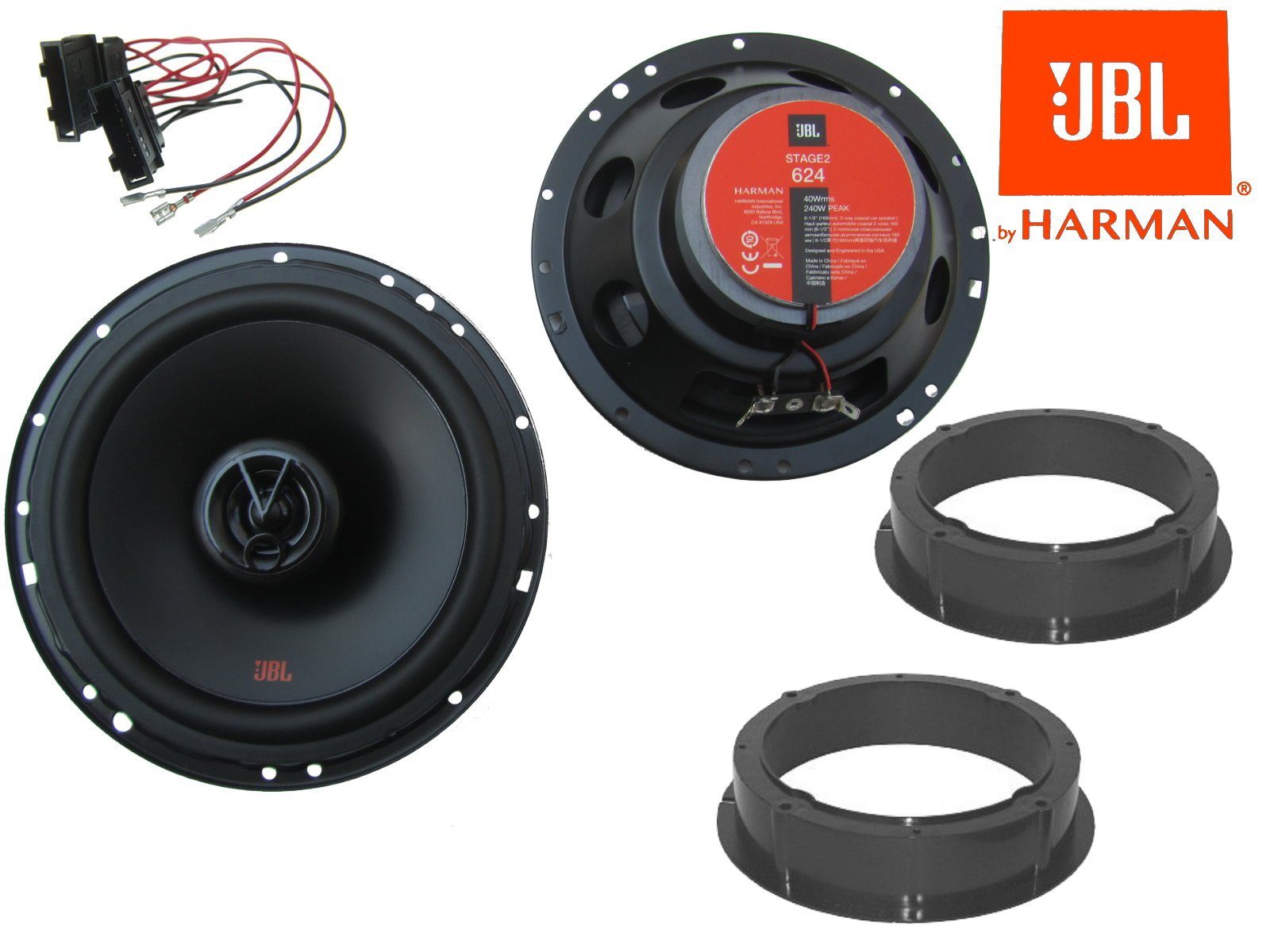 Lieferumfang | 2 x Stück JBL Lautsprecher 2x Lautsprecher Adapter Ringe 2x Lautsprecherstecker |