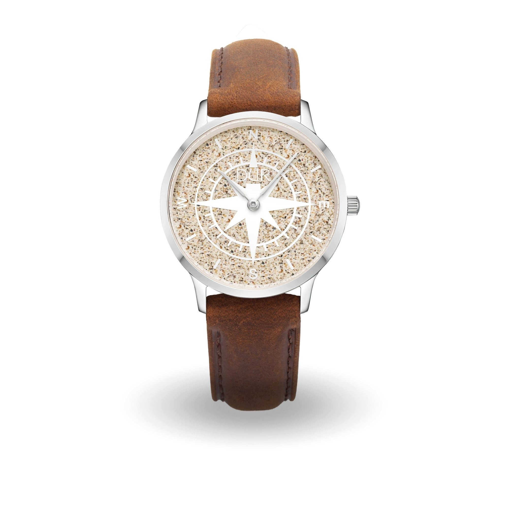 DUR Schmuck Uhr Watch "Kompass", und polierten Zeigern in Schwertform. Auf dem Ziffernblatt ist eine horizontal mattierte Kompassrose mit Strandsand gefüllt, an einem 18 mm breiten, braun gesteppten, Rindslederband