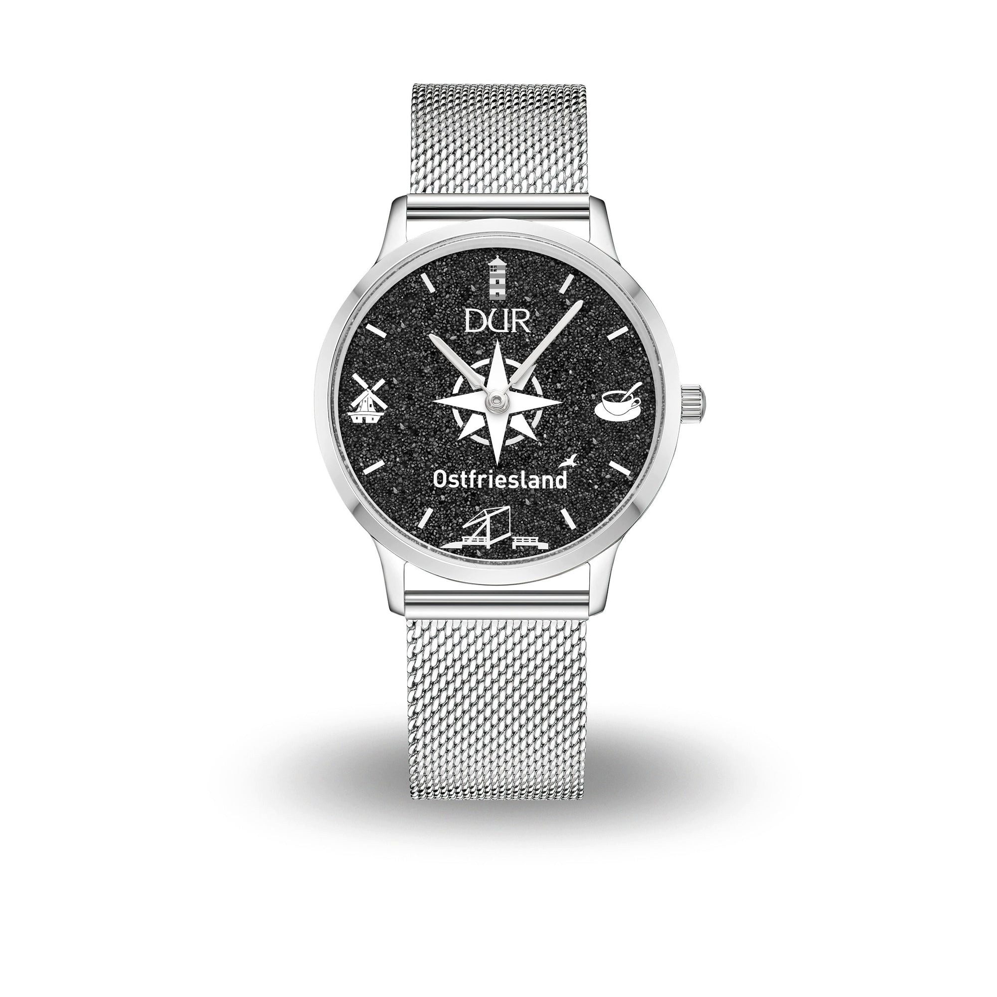 DUR Uhr "Ostfriesland", wasserdichte Edelstahl DUR Uhr mit Saphirglas. Auf dem Ziffernblatt die Motive:-Pilsumer Leuchtturm-Teetasse-Fehnbrücke-Windmühle und in der Mitte eine Kompassrose, die mit Lavasand gefüllt sind. An einem 18 mm breitem Edelstahl Meshband.