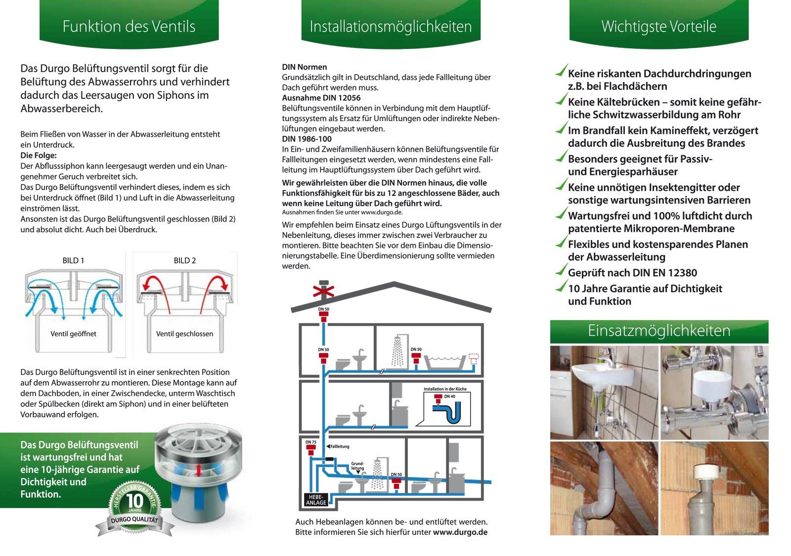 Wartungsfreie Durgo Belüftungsventile aus schlagfestem ABS Kunststoff zum Einbau innerhalb von Gebäuden. Freier Lufteinlass ohne Siebe oder Gitter durch eine dauerelastische Mikroporen-Membran. Geprüft und zugelassen nach DIN EN 12 380.