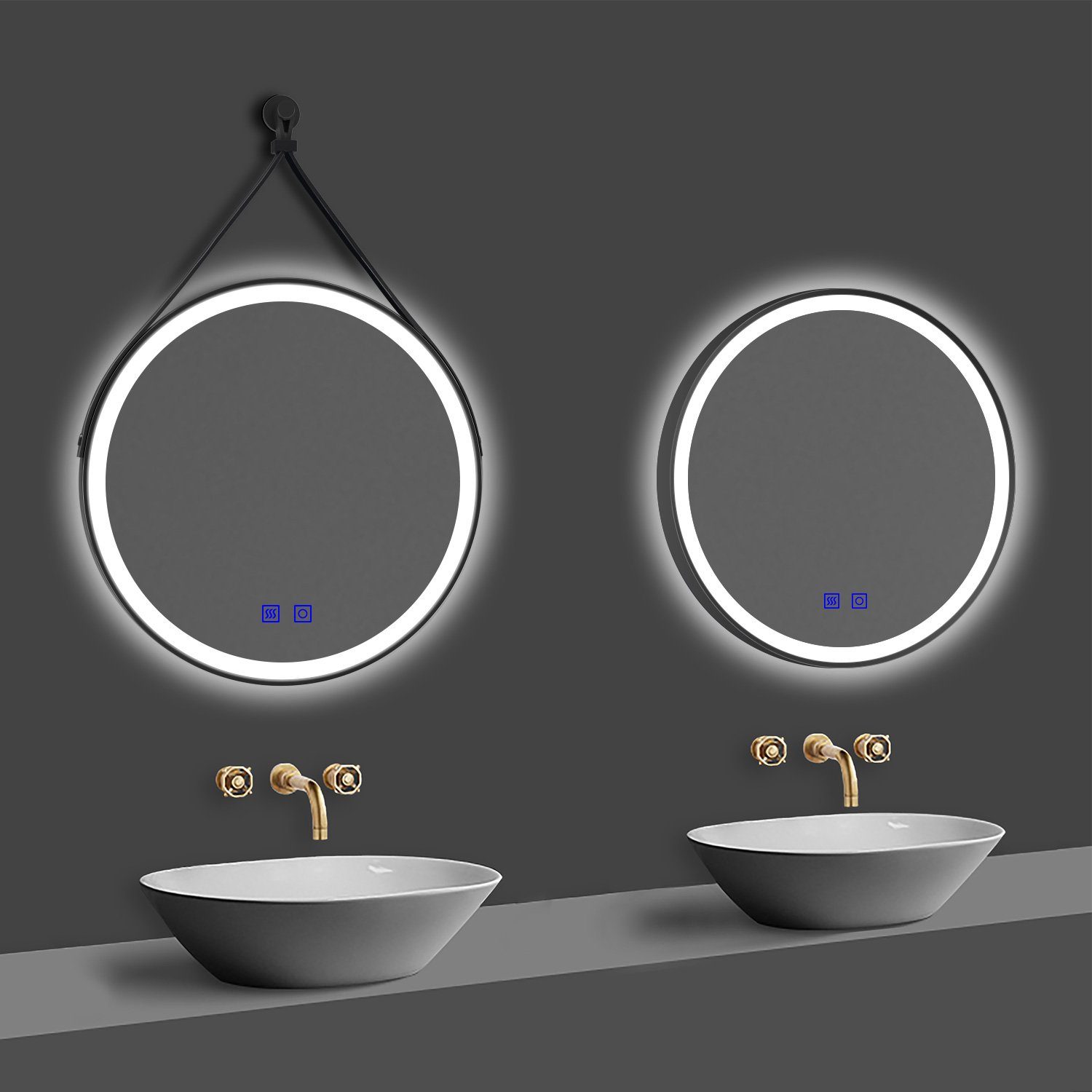 Eigenschaften | Badspiegel Rund mit Schwarz Rahmen mit Ledergürter(abnehmbar) Drei Lichtfarbe+dimmbar+Memory |