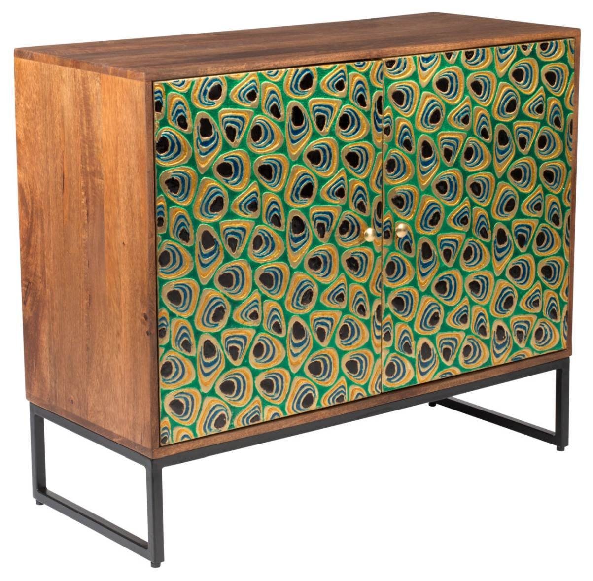 Der solide Korpus ist aus Mangoholz gefertigt. Die Oberflächen sind lackiert. Die Türen sind mit Messingplatten verkleidet und bemalt. Das Untergestell mit Kufen besteht aus Metall und ist ebenfalls lackiert.