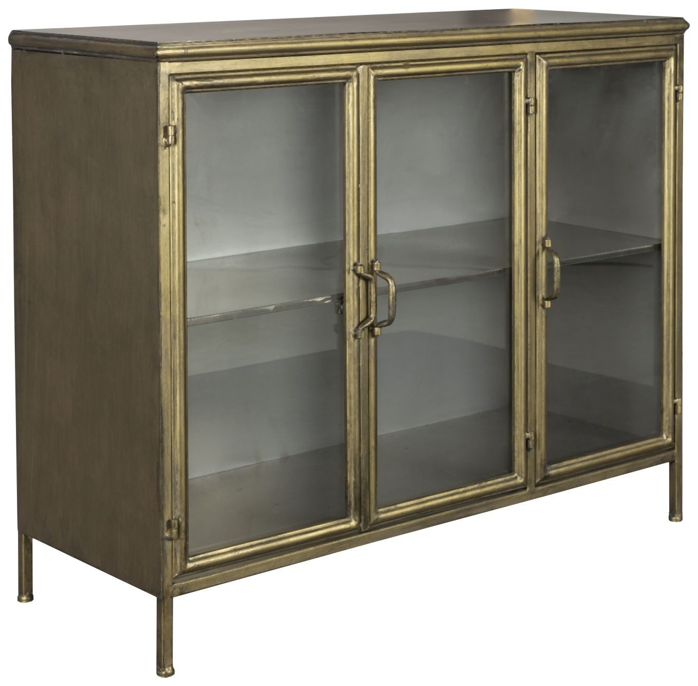 Das hochwertig verarbeitete Sideboard ist aus stabilem Stahl gefertigt. Die Oberflächen sind pulverbeschichtet und tragen Gebrauchsspuren. Die Einlagen in den Drehtüren sind aus Klarglas hergestellt. Das feine Glas ist geschliffen und poliert.