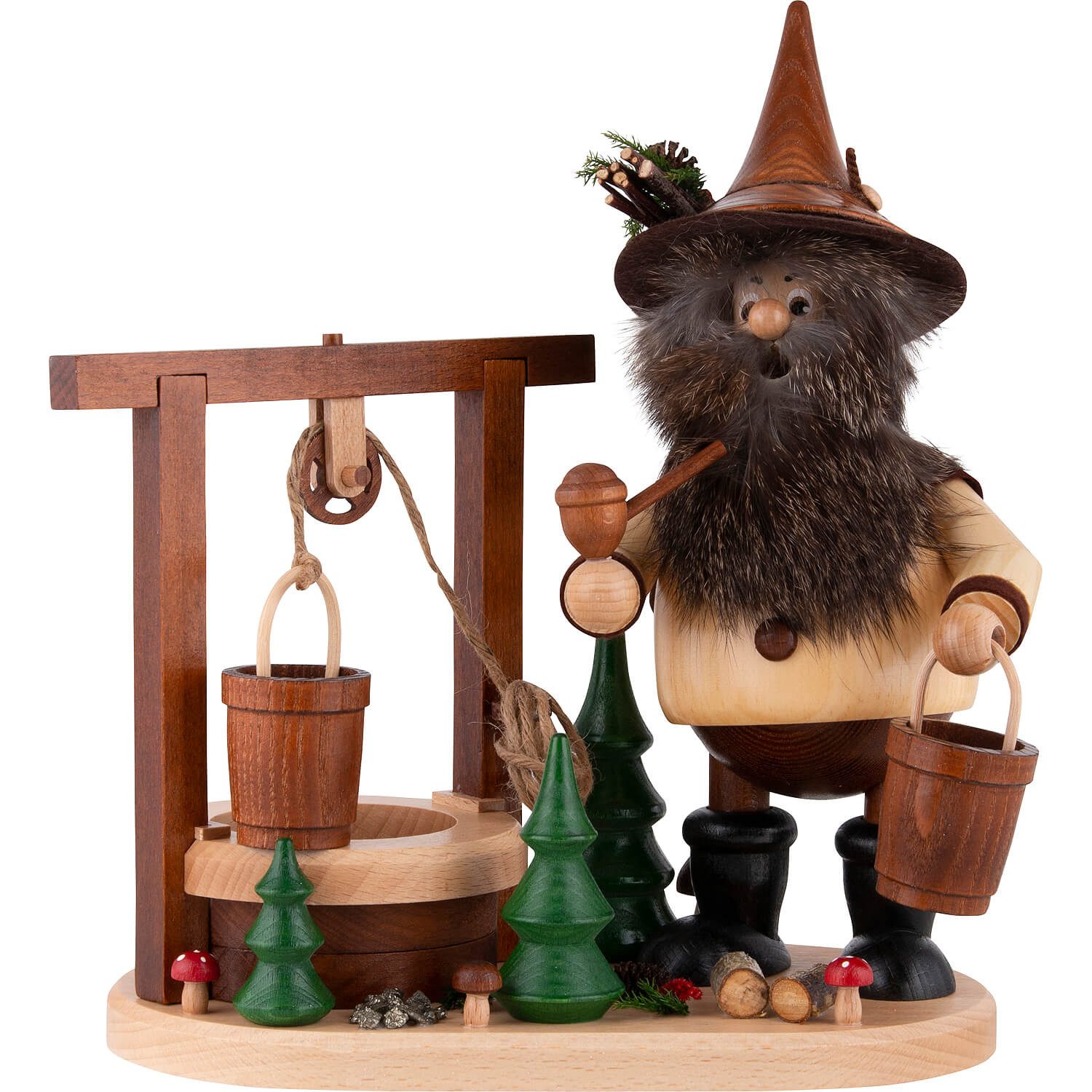 Ein Produkt aus der 'Erzwichtel'-Serie - Die Räucherwichtel der Drechselwerkstatt Uhlig werden im erzgebirgischen Aue aus einheimischen Hölzern gefertigt. Ihre Markenzeichen sind die üppigen, natürlich gestalteten Bärte. Da es sich beim Bart um ein Naturfell handelt, kann sich die Farbgebung im Bereich grau bis bräunlich bewegen. Die Farbe des Bartes entspricht nicht in jedem Fall der abgebildeten Figur. Die Erzwichtel-Serie ist der regionalen Bergbau-Tradition gewidmet und zeigt verschiedene Arbeiten des historischen Erzabbaus.
