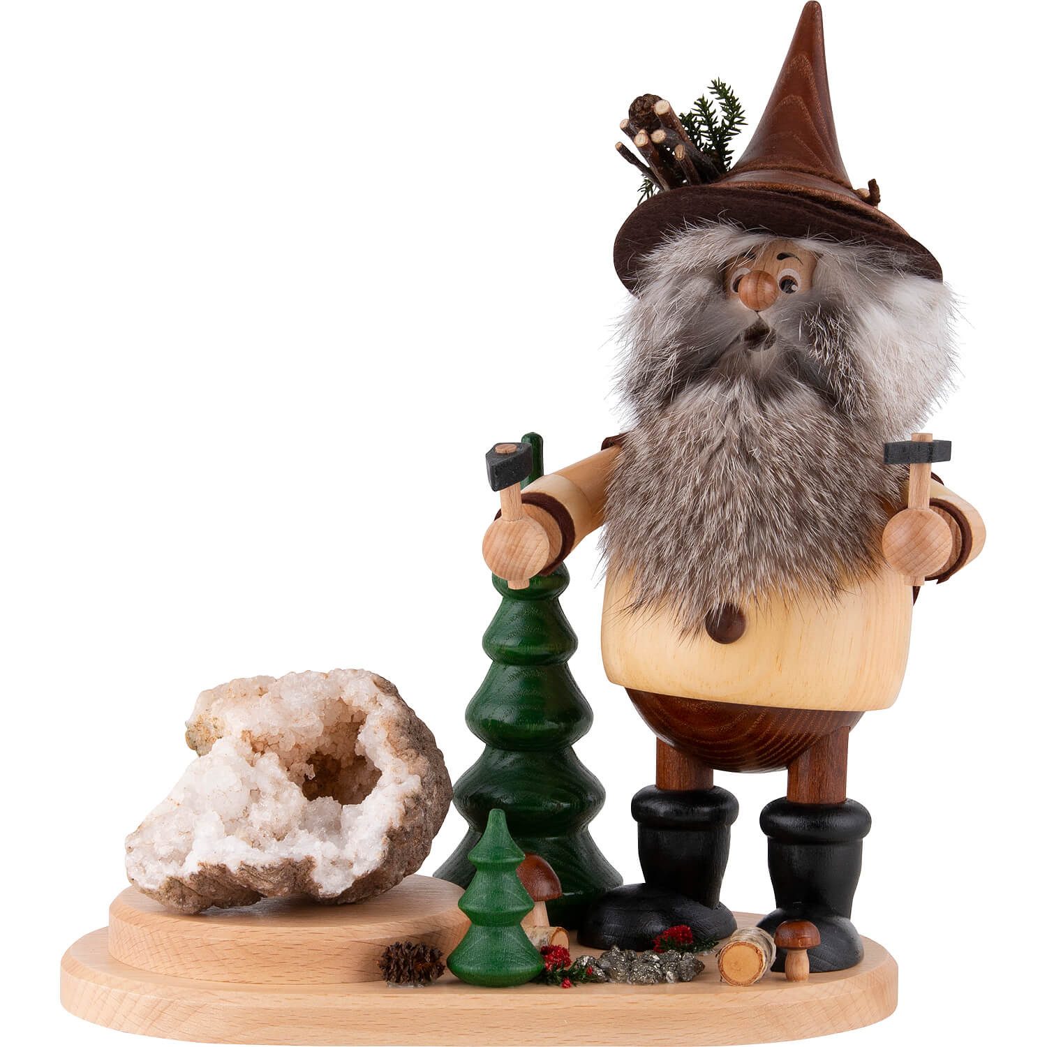 Ein Produkt aus der 'Erzwichtel'-Serie - Die Räucherwichtel der Drechselwerkstatt Uhlig werden im erzgebirgischen Aue aus einheimischen Hölzern gefertigt. Ihre Markenzeichen sind die üppigen, natürlich gestalteten Bärte. Da es sich beim Bart um ein Naturfell handelt, kann sich die Farbgebung im Bereich grau bis bräunlich bewegen. Die Farbe des Bartes entspricht nicht in jedem Fall der abgebildeten Figur. Die Erzwichtel-Serie ist der regionalen Bergbau-Tradition gewidmet und zeigt verschiedene Arbeiten des historischen Erzabbaus. Der echte Stein neben dem Räuchermann ist bei jedem Exemplar von unterschiedlicher Art und macht jeden Erzwichtel Hauer zu einem Unikat.