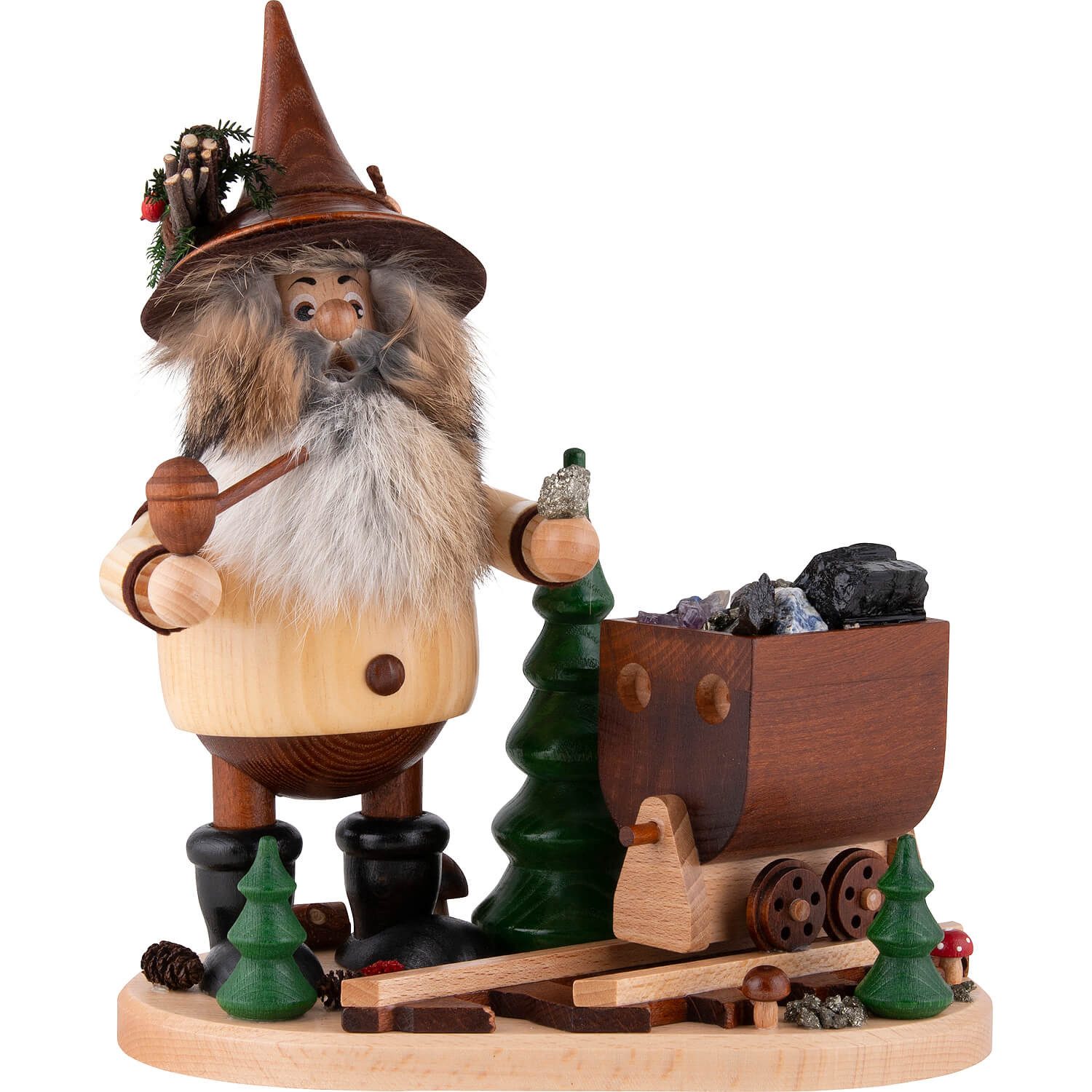 Ein Produkt aus der 'Erzwichtel'-Serie - Die Räucherwichtel der Drechselwerkstatt Uhlig werden im erzgebirgischen Aue aus einheimischen Hölzern gefertigt. Ihre Markenzeichen sind die üppigen, natürlich gestalteten Bärte. Da es sich beim Bart um ein Naturfell handelt, kann sich die Farbgebung im Bereich grau bis bräunlich bewegen. Die Farbe des Bartes entspricht nicht in jedem Fall der abgebildeten Figur. Die Erzwichtel-Serie ist der regionalen Bergbau-Tradition gewidmet und zeigt verschiedene Arbeiten des historischen Erzabbaus.