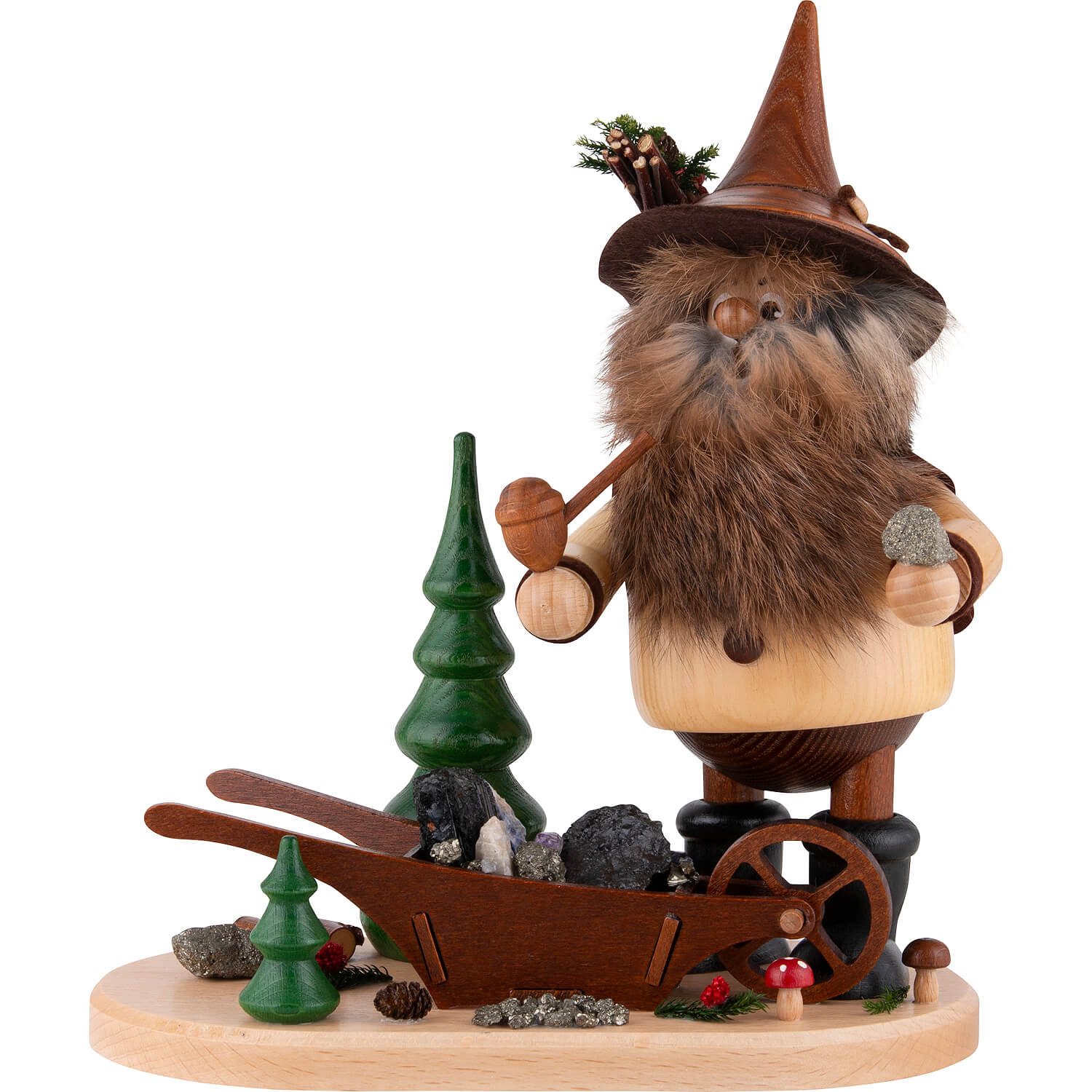 Ein Produkt aus der 'Erzwichtel'-Serie - Die Räucherwichtel der Drechselwerkstatt Uhlig werden im erzgebirgischen Aue aus einheimischen Hölzern gefertigt. Ihre Markenzeichen sind die üppigen, natürlich gestalteten Bärte. Da es sich beim Bart um ein Naturfell handelt, kann sich die Farbgebung im Bereich grau bis bräunlich bewegen. Die Farbe des Bartes entspricht nicht in jedem Fall der abgebildeten Figur. Die Erzwichtel-Serie ist der regionalen Bergbau-Tradition gewidmet und zeigt verschiedene Arbeiten des historischen Erzabbaus.