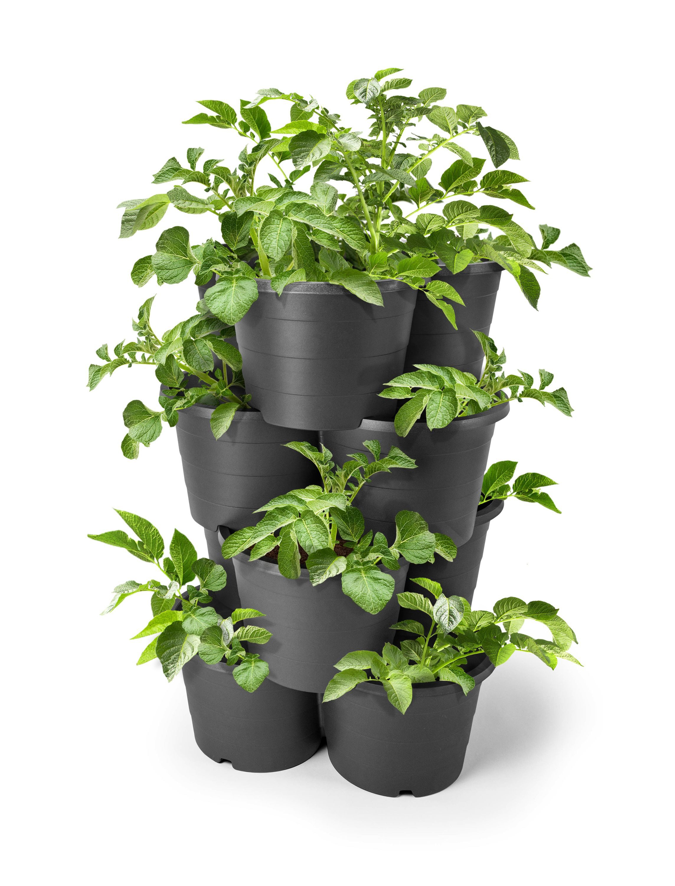 Hier kommt die perfekte Lösung für alle, die gerne Ihre Kräuter oder Gemüsepflanzen selbst anbauen möchten, aber nur einen kleinen Pflanzbereich z.B. auf dem Balkon zur Verfügung haben. Dieser platzsparende Pflanzturm aus recyceltem Kunststoff besteht aus insgesamt vier großen Pflanzschalen zum Aufeinanderstapeln. In den unteren drei Schalen finden verschiedene Pflanzen oder Kräuter in den jeweiligen drei Ecken ausreichend Platz zum Wachsen und Gedeien. Die oberste Schale kann komplett bepflanzt werden. Die einzelnen Schalen verfügen über genügend Wasser-Ablauflöcher, so dass ein einfaches Gießen von oben begünstigt wird.