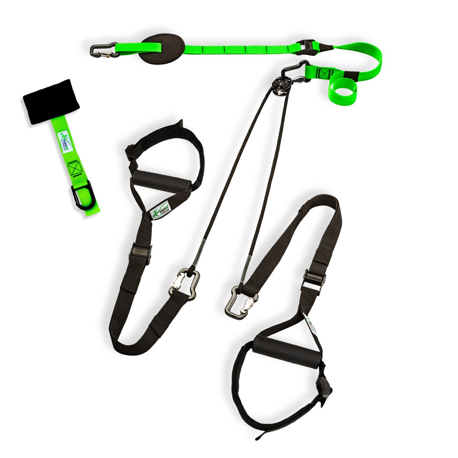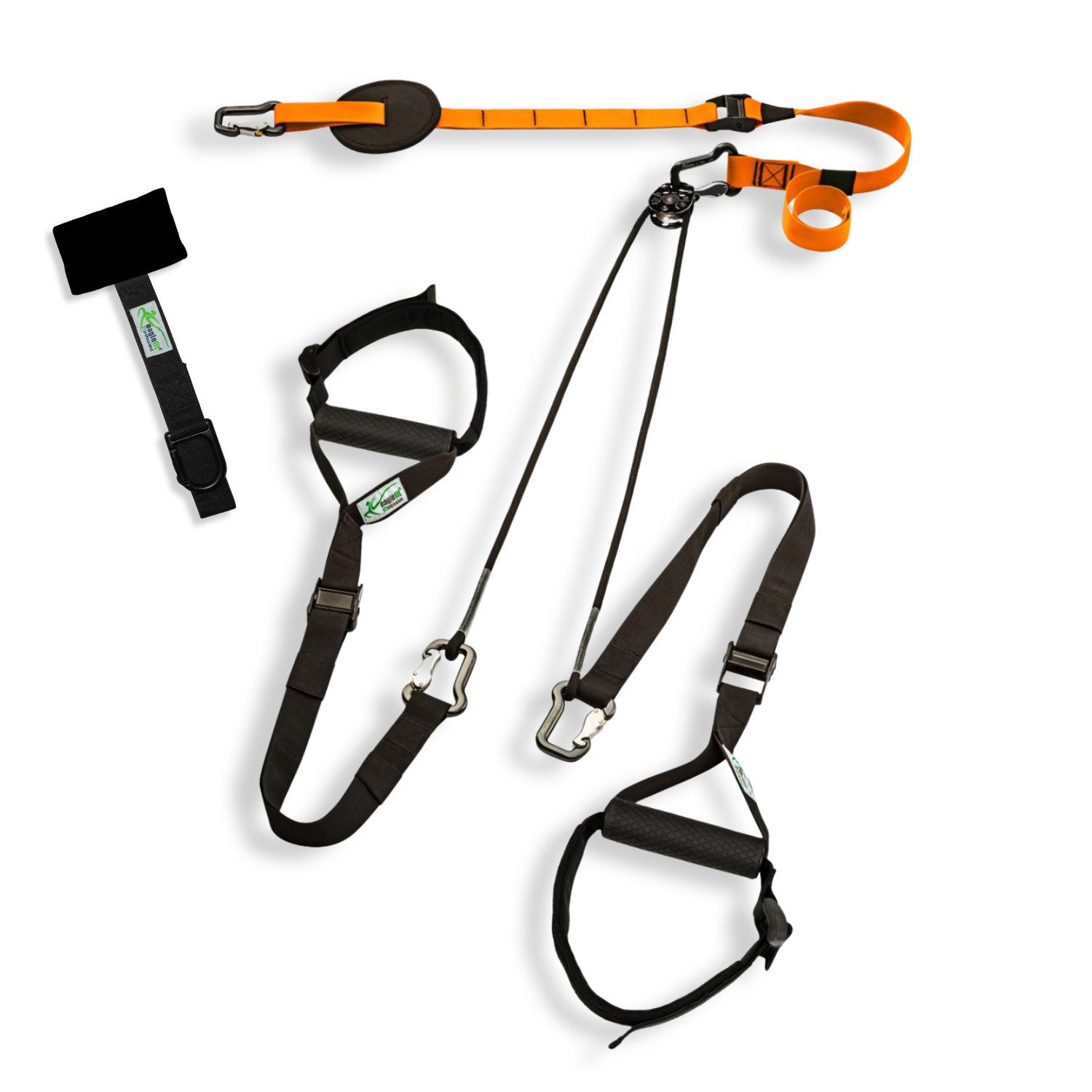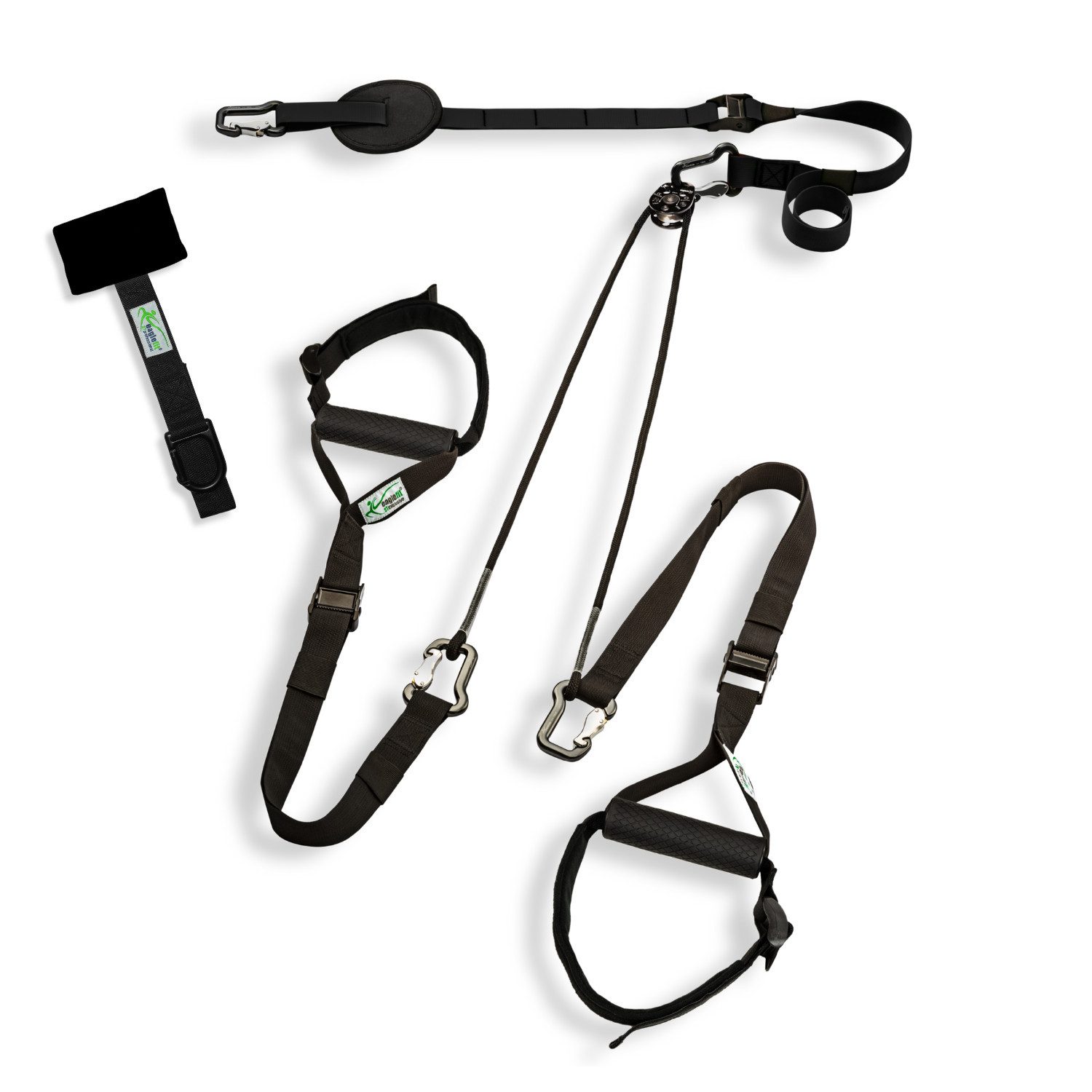 Das Besondere: Desinfizierbare, vulkanisierte gummierte Grip-Griffe, verstellbare Fußschlaufen, kugelgelagerte Umlenkrolle (bis 30 kN belastbar), 4 Aluminium-Sicherheitskarabiner – alles in einem leichten, mobilen Paket für Training überall.