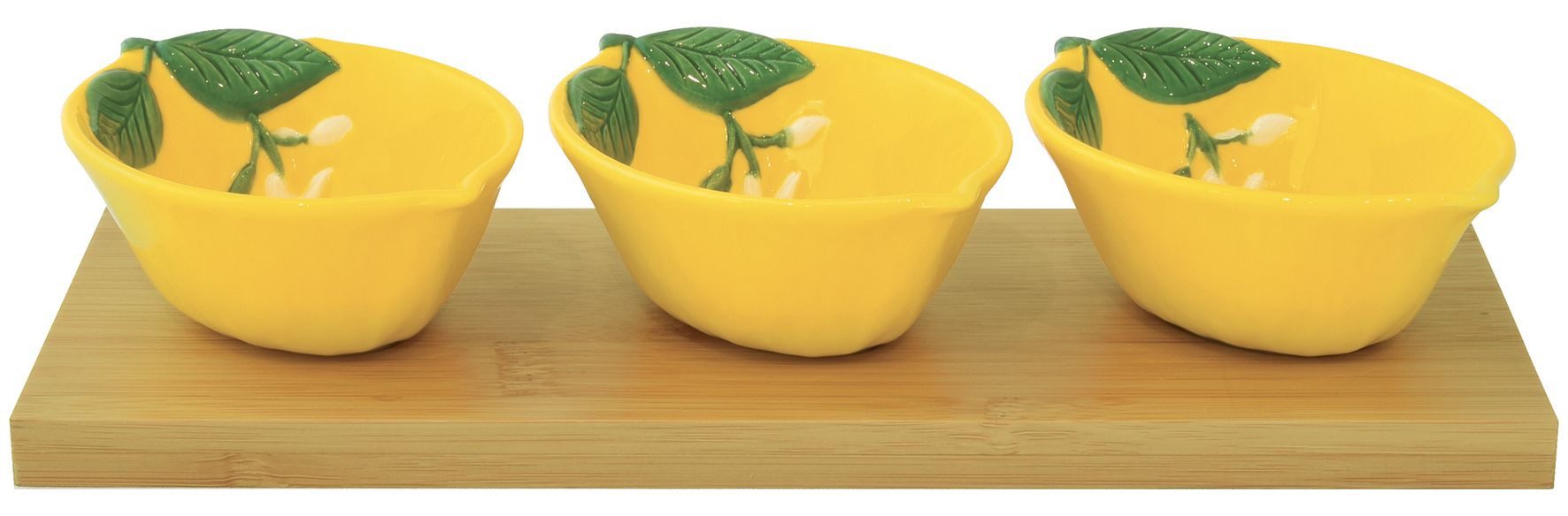 • Lieferumfang: 3 Dipschalen FLEURS ET CITRONS LIMONE Zitronenform auf Tablett 25x9,5cm gelb grün Porzellan + Holz in Geschenkbox