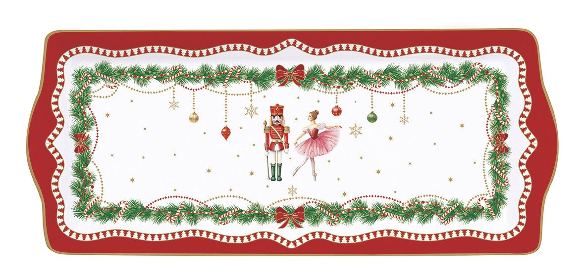 Lieferumfang: Servierplatte MAGIE DE NOEL mit Nussknacker und Ballerina, geschmückter Tannengirlande mit Zuckerstangen, Weihnachtskugeln und goldenem Rand in Geschenkbox