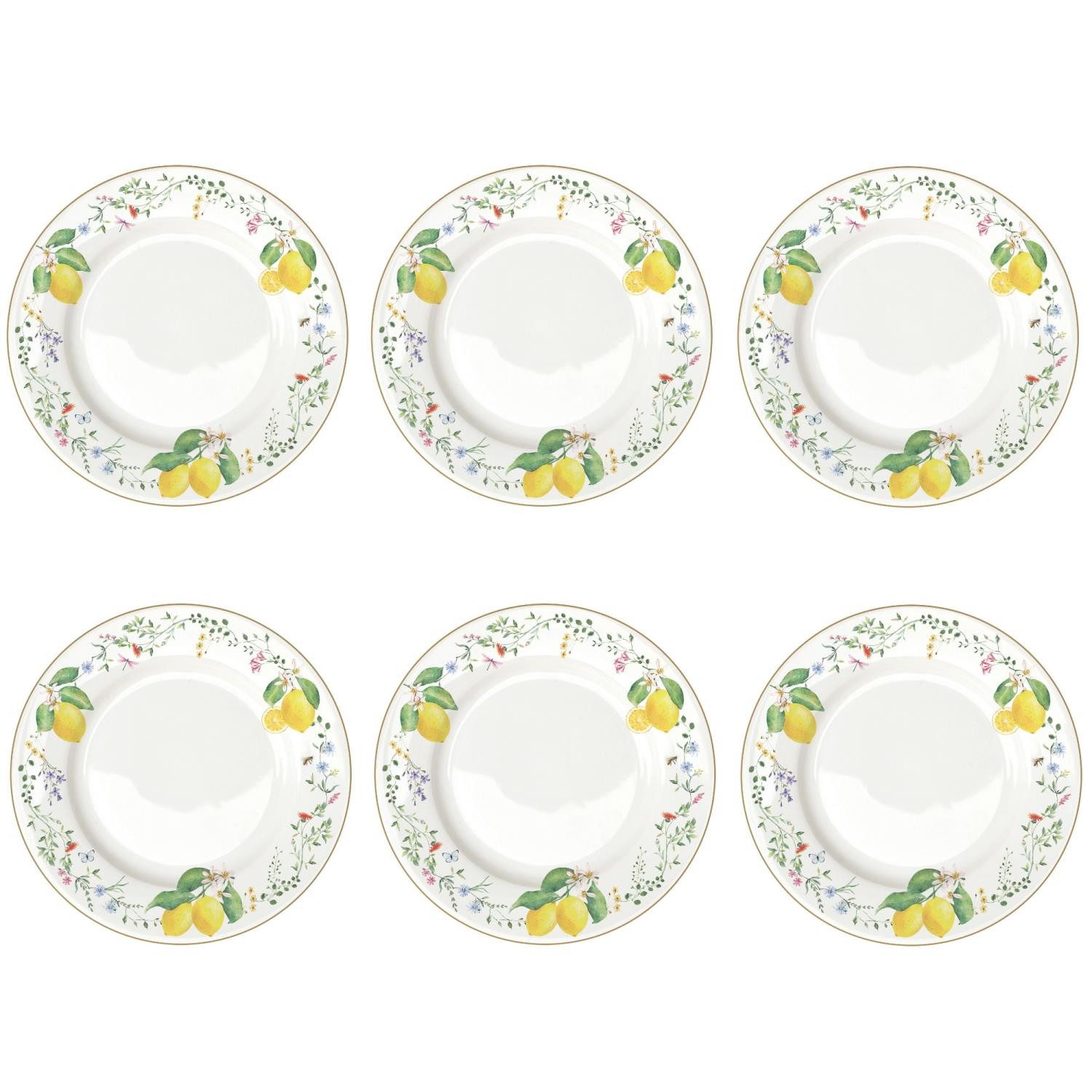 • Lieferumfang: 6 Speiseteller FLEURS ET CITRONS Zitronen D. 26,5cm mit kleinen Blüten, Blätterranken, Zitronen und Libellenmotiv