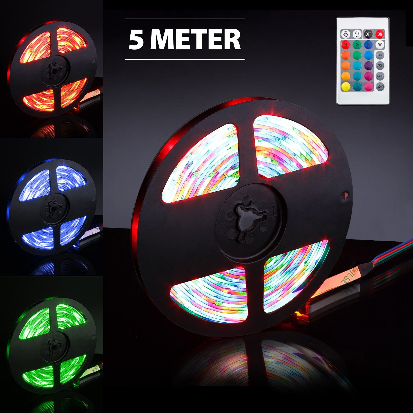 Lieferumfang | 5 Meter RGB Lichterband 1× RGB Infrarot-Controller 1× IR-Fernbedienung 1× 12 V Netzteil inkl. 150 cm Stromkabel |