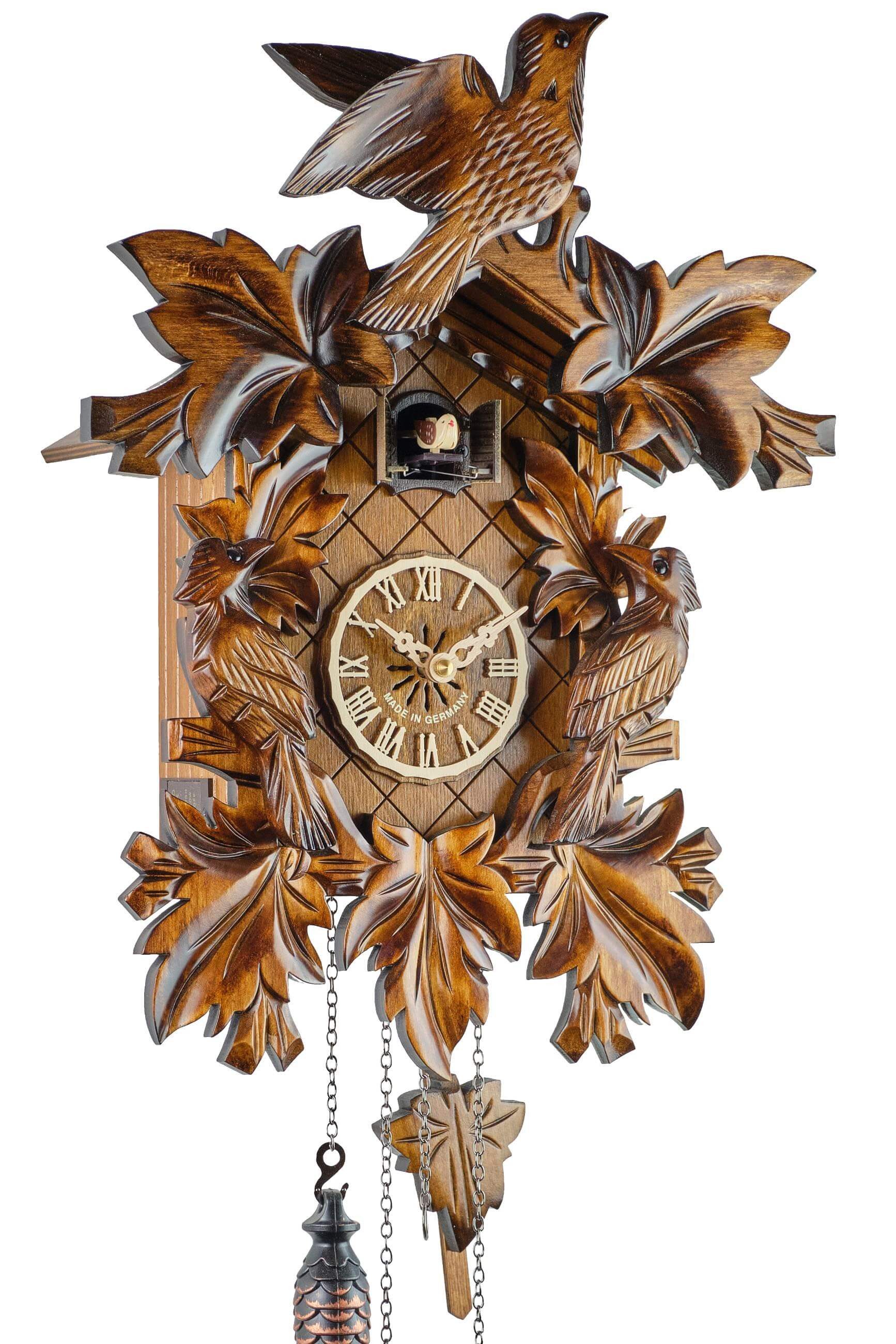 Drei handgeschnitzte Vögel verzieren diese klassische Schnitzerei. Dieses Motiv war eines der ersten, als die Kuckucksuhr anno 1738 erfunden wurde.