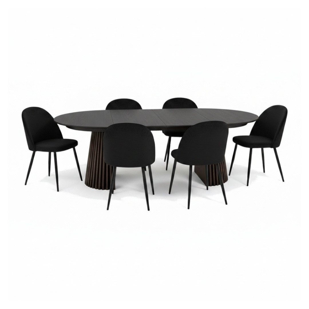 Materialzusammensetzung | MDF. Eichenfurnier. 100 % Polyester. Formgespanntes Holz. Schaumstoff. Stahl. Pulverbeschichtet schwarz. |