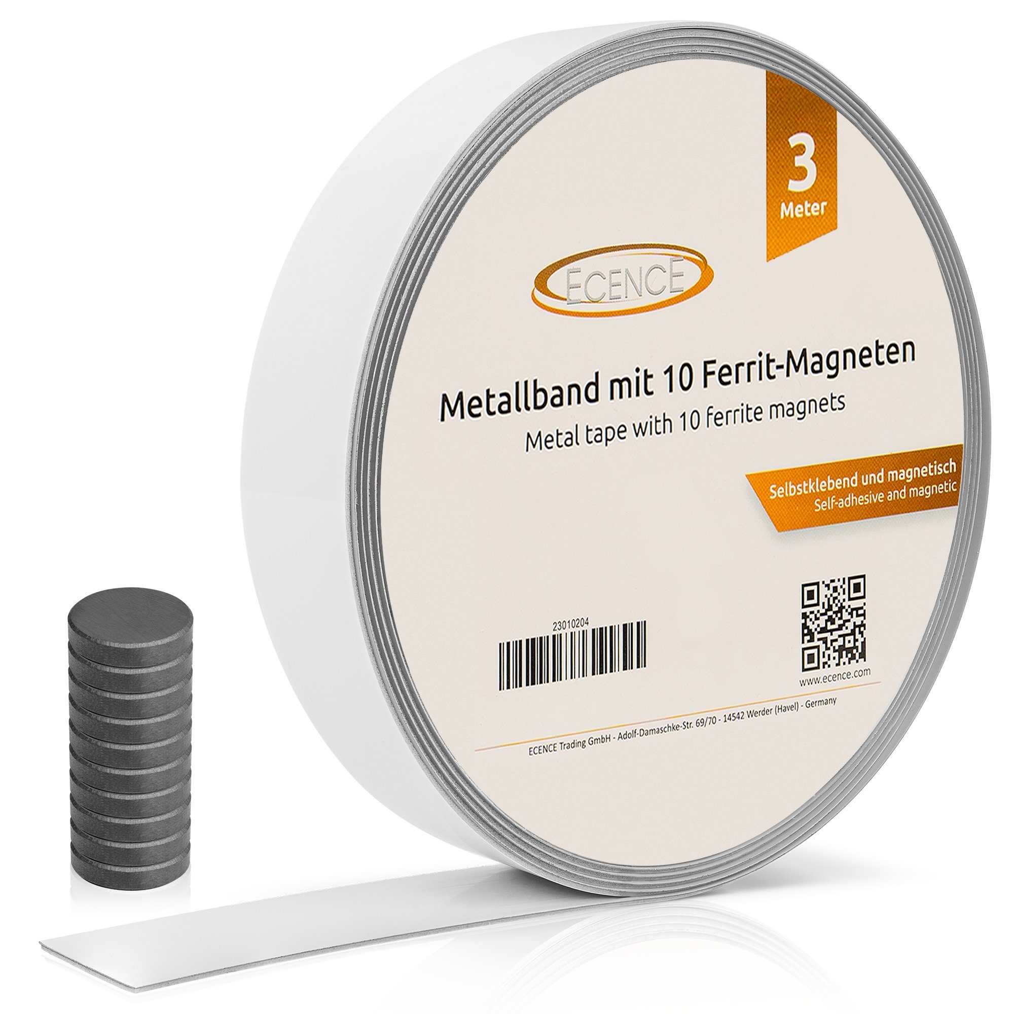 ECENCE 3m Metallband selbstklebend, Organizer mit starker Haftung mit 10x Ferrit Magneten, Ferroband, Stahlband, Metallstreifen ideal für Zettel, Bilder, Notizen