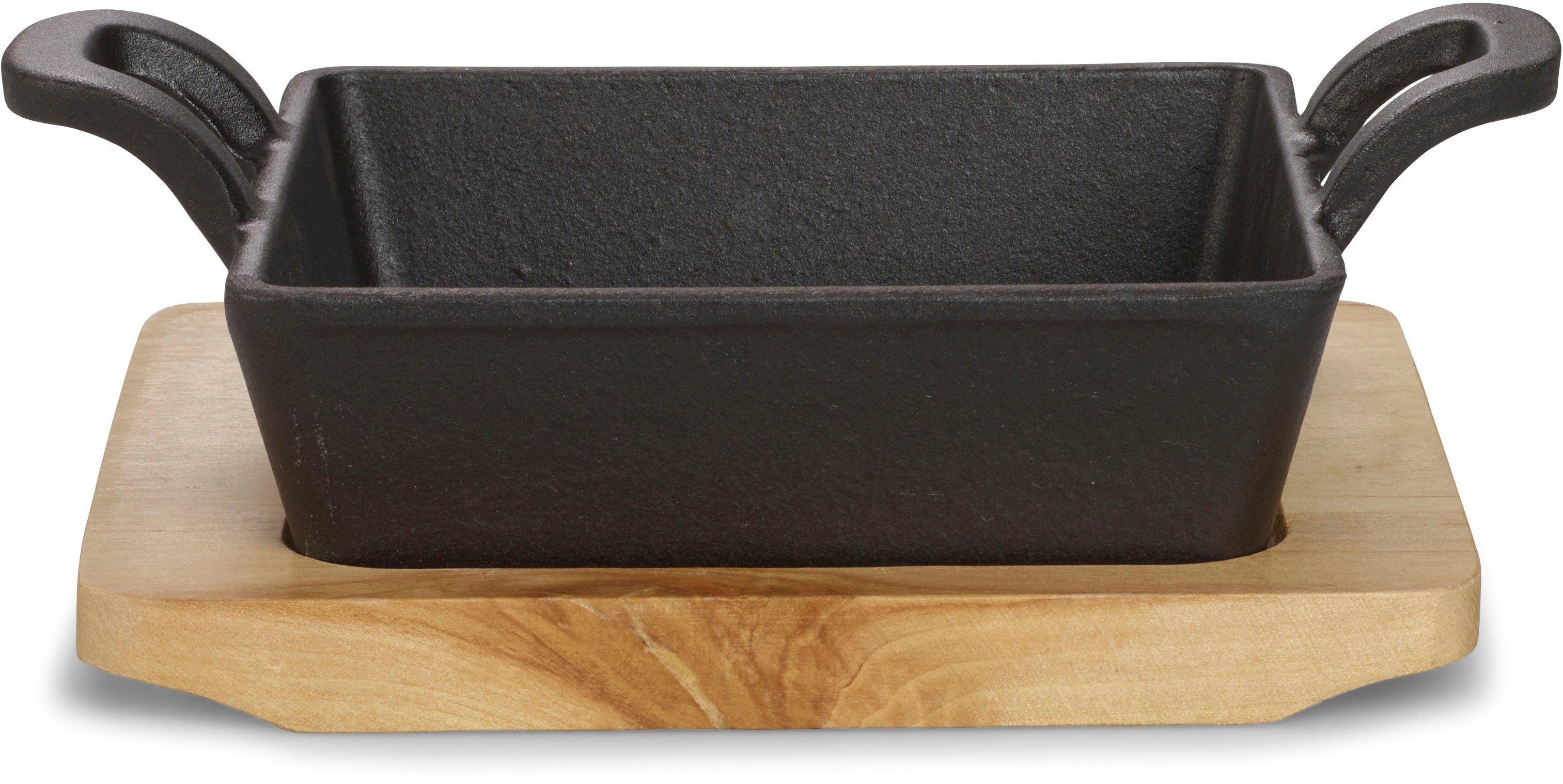 LANGLEBIG: hochwertige Gusseisen-Servierschale (12,6 x 12,6 (mit Griff 18,5) x 3,6 cm) – Optik und Funktionalität vereint für gleichmäßiges Garen köstlicher Häppchen