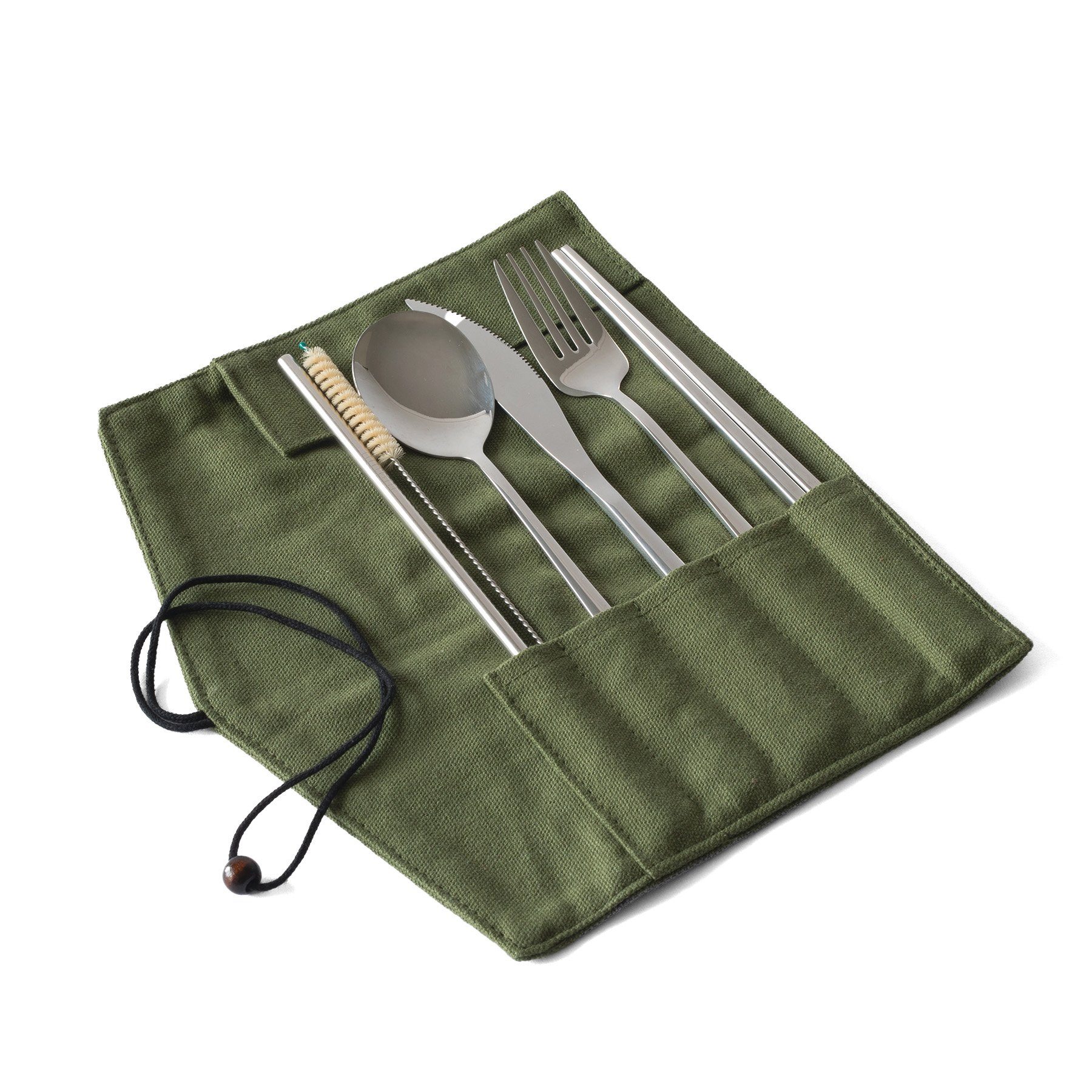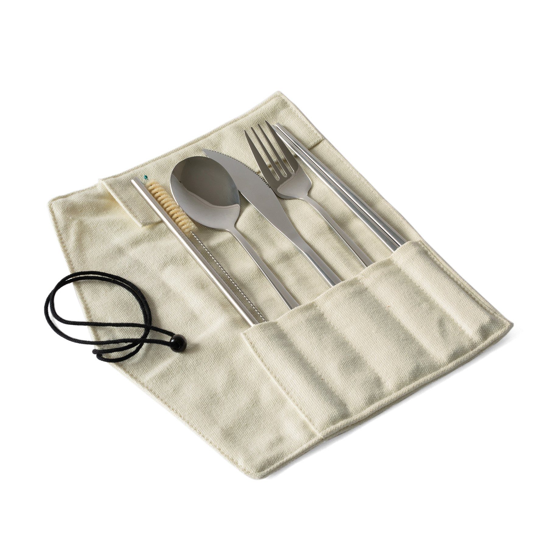 Besteckset mit einen Edelstahl Trinkhalm + Reinigungsbürste, ein Messer, einen Löffel, eine Gabel und zwei Edelstahl-Essstäbchen
