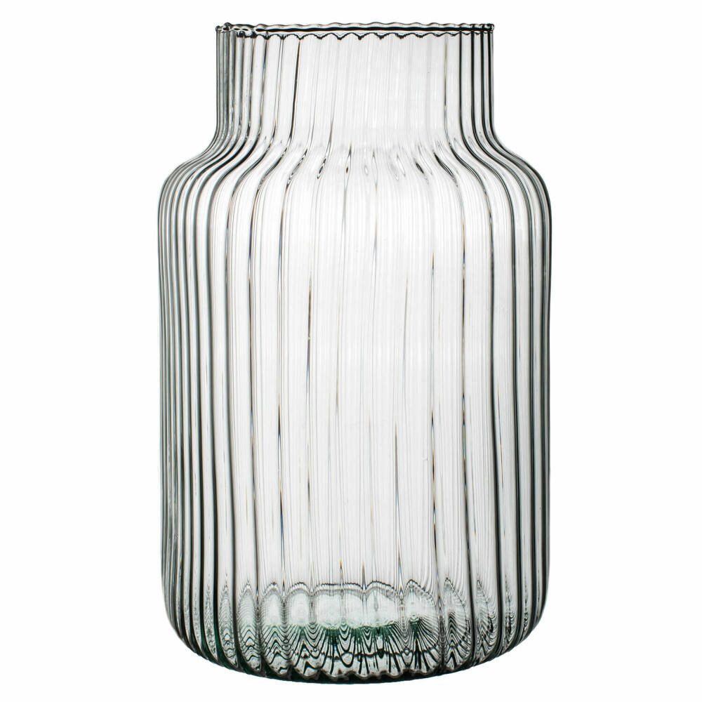 Diese Vase aus recyceltem Glas hat eine elegante Form, die an ein hohes Gefäß erinnert. Ihre Oberfläche ist mit einem trendigen Rippeneffekt verziert, der Struktur verleiht und subtile Lichtreflexe erzeugt, die ihr anspruchsvolles Aussehen unterstreichen. Das transparente Glas, oft mit natürlichen Grüntönen, unterstreicht ihre moderne und dennoch naturelle Ausstrahlung. Diese Glasvase ist sowohl dekorativ als auch äußerst funktional. Sie eignet sich perfekt als Blumenvase für frische oder getrocknete Blumen und ist eine elegante Ergänzung für jeden Raum. Ihre hohe, zylindrische Form macht sie auch ideal als Pampasgrasvase oder zum Präsentieren dekorativer Zweige. Darüber hinaus kann sie als Bodenvase dienen und größere Räume wie Wohnzimmer, Schlafzimmer oder Eingangsbereiche ergänzen.