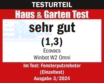 Der Ecovacs Winbot W2 Omni erzielt im Einzeltest des Magazins „Haus & Garten Test“ das Gesamtergebnis „sehr gut (1,3)“. Die hohe Reinigungsleistung und die verschiedenen Reinigungsprogramme überzeugen: Das Gerät reinigt „streifenfrei und gründlich“. Es ist über die App via Bluetooth sehr einfach zu bedienen. Außerdem ist die Ökologie „sehr gut“. Insgesamt liefert der Fensterputzroboter mit Basisstation „Flexibilität und durchdachtes Design“.