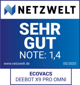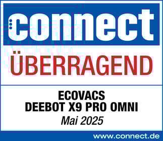 Das Onlinemagazin „connect.de“ testet den Ecovacs DEEBOT X9 Pro Omni im Einzeltest. Der Saug-Wisch-Roboter bietet eine „überragende“ Reinigungsleistung. Die „sehr gute“ Ausstattung überzeugt u. a. mit einer tollen App. Zwar sind „keine Ersatzteile im Lieferumfang“. Aber die Bedienung ist „überragend“. Außerdem punktet die „smarte Navigation mit sehr guter Hindernisumfahrung“. Das Modell erreicht das Gesamtergebnis „ÜBERRAGEND“.