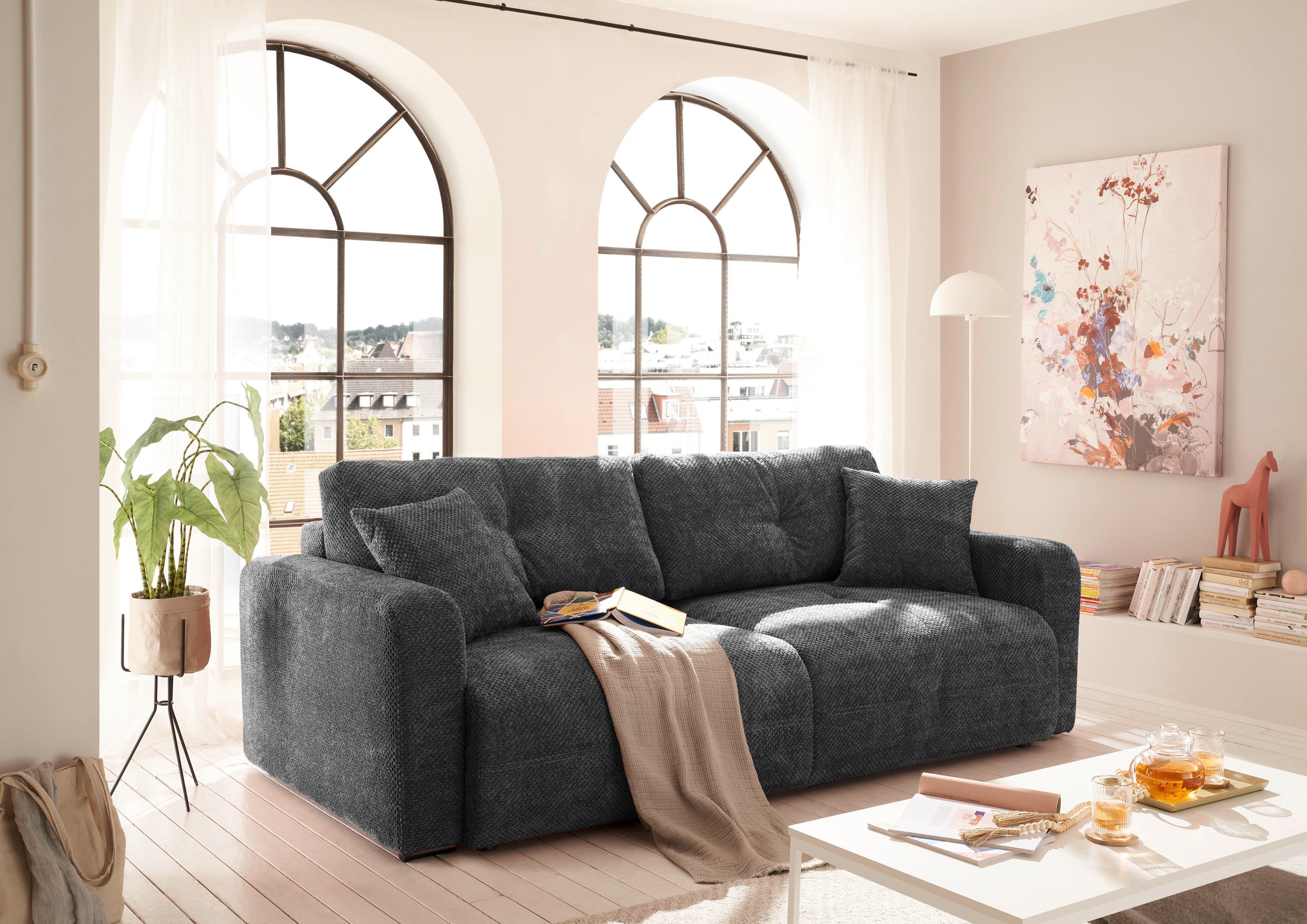 Dieses Schlafsofa »Bullet« von ED EXCITING DESIGN bietet dir dank der Wellenunterfederung hohen Sitzkomfort und Tragfähigkeit. Darüber hinaus verfügt das Möbelstück über eine ausziehbare Liegefläche, sodass es sowohl als gemütliche Sitzgelegenheit für den Tag als auch als Gästebett genutzt werden kann. Wovon du auch profitierst, sind die passenden Zierkissen, die dekorativ und zugleich komfortabel sind. Die Füße aus Kunststoff punkten mit der Temperaturbeständigkeit und sind zudem formstabil.
