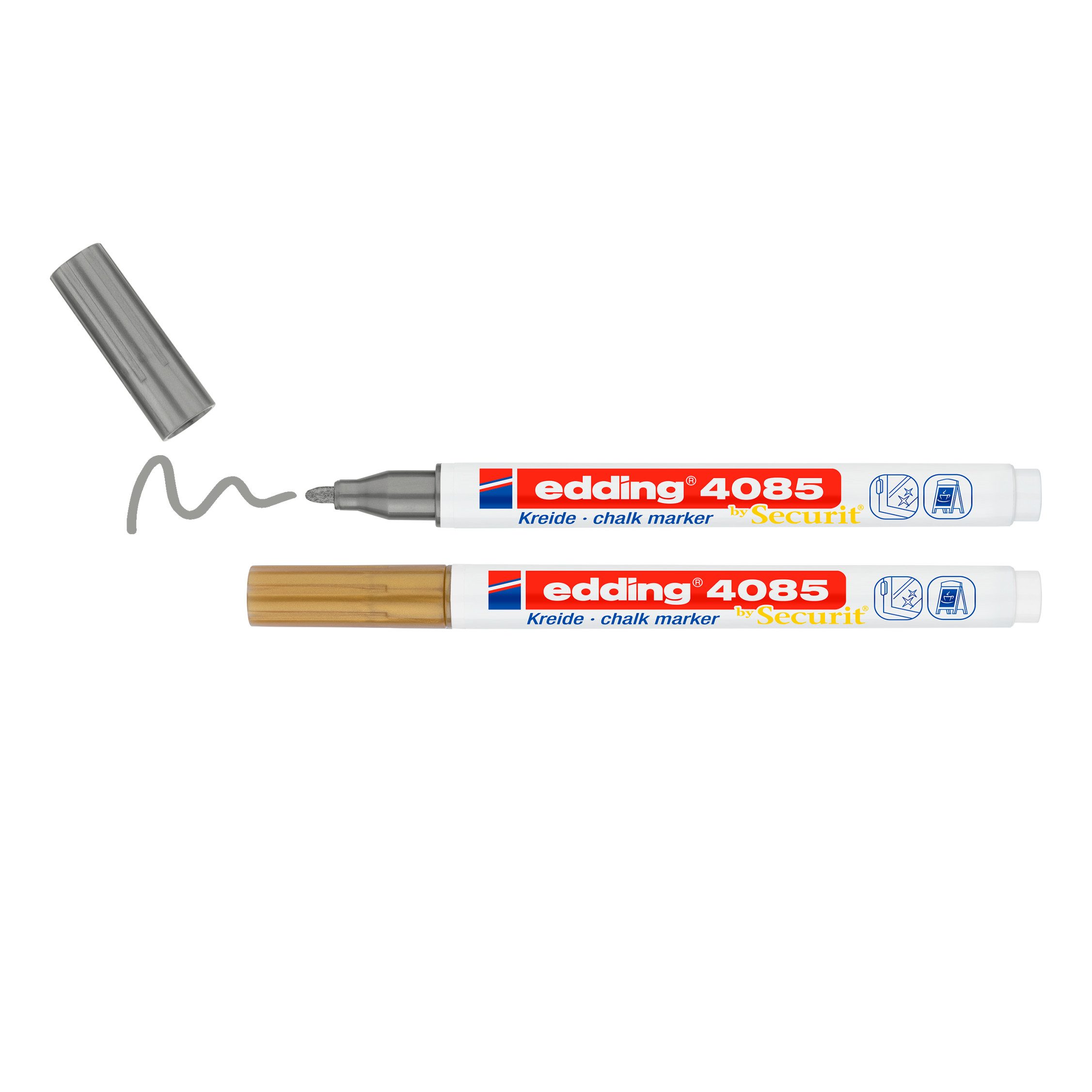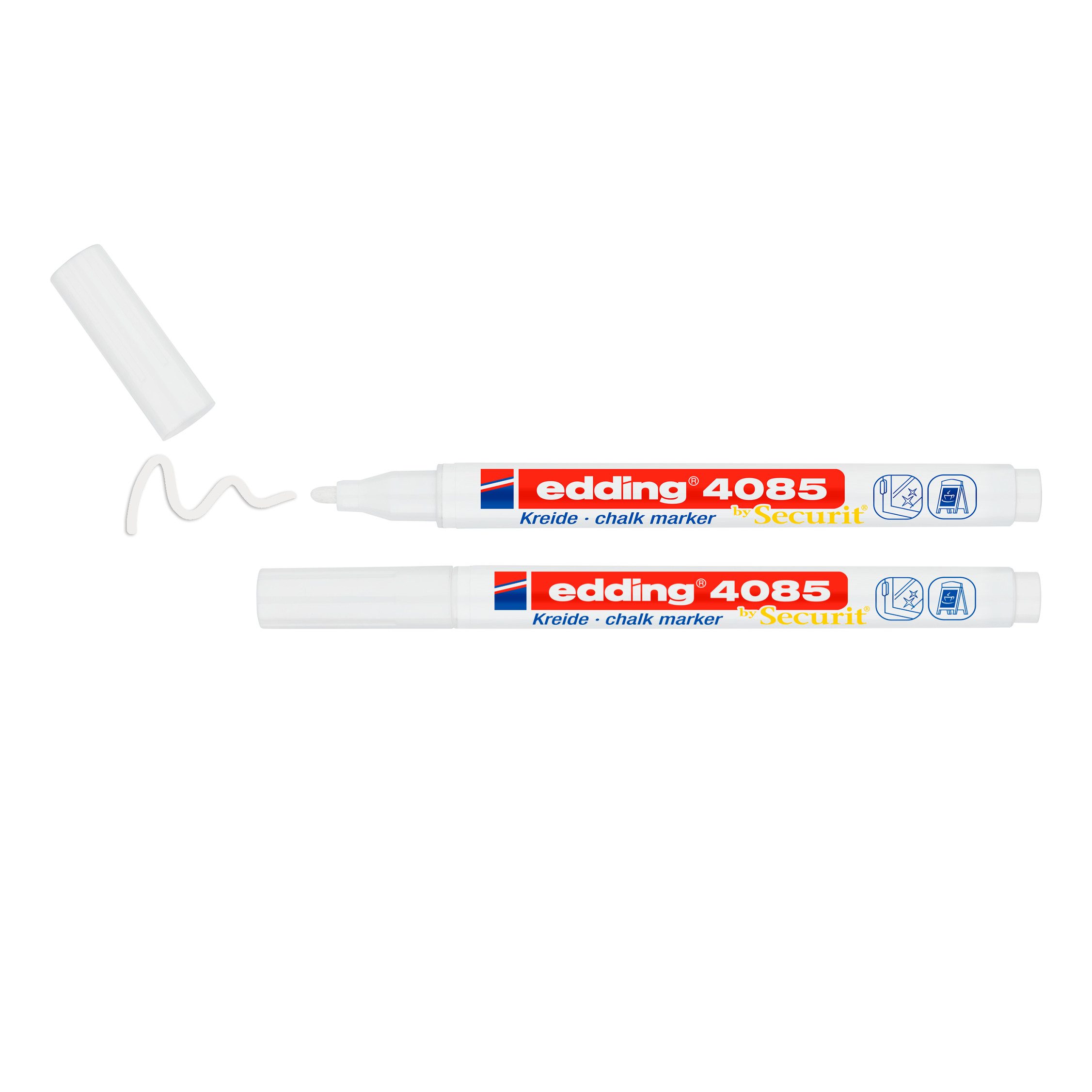 edding 4085 Kreidemarker 2er-Set mit Rundspitze und der feinen Strichstärke von ca. 1 – 2 mm. Für präzises Beschriften auf dunklen Kreidetafeln, Glas, Fensterscheiben oder auch Spiegeln. Nicht-permanent und kann mit einem feuchten Tuch wieder abgewischt werden.