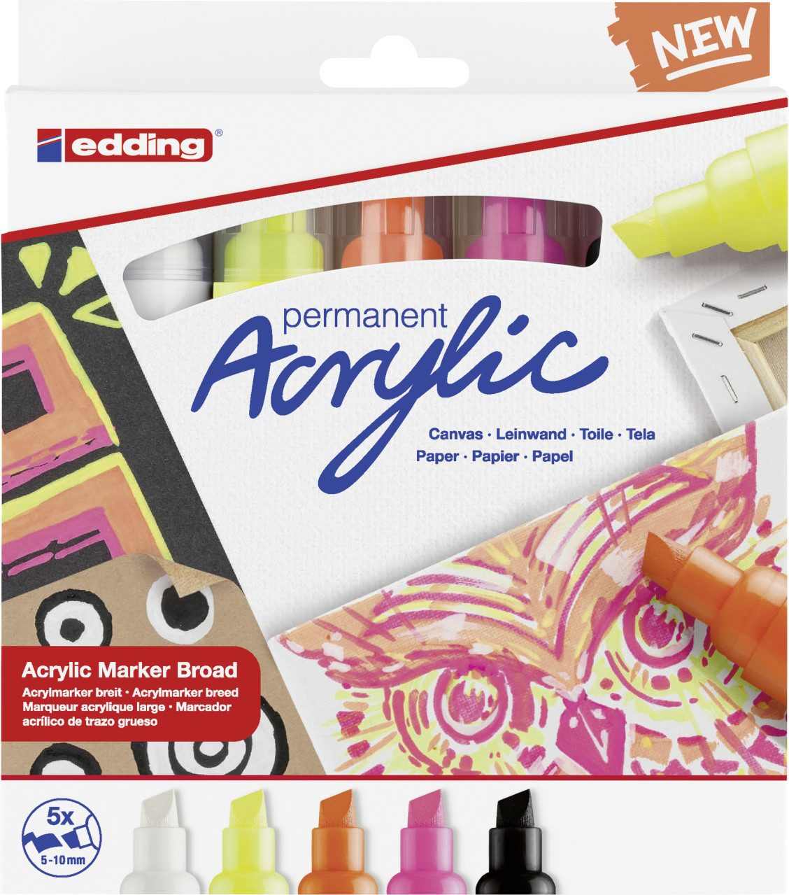 Acrylmarker zum Malen auf hellen oder dunklen Oberflächen, ideal für Materialien wie Leinwand, Malpapier, Holz, Stein oder Terrakotta. Die Keilspitze hat eine Strichbreite von 5 - 10 mm. Die hochwertige pigmentierte Acrylfarbe auf Wasserbasis ist deckend, lichtbeständig, geruchsarm und nach dem Trocknen permanent. Das Set enthält die Farben verkehrsweiß, schwarz, neongelb, neonorange und neonpink. In hochwertigem wiederverwendbarem Etui. Geeignete Ersatzspitzen (edding 5000 Ersatzspitzen) sind erhältlich.
