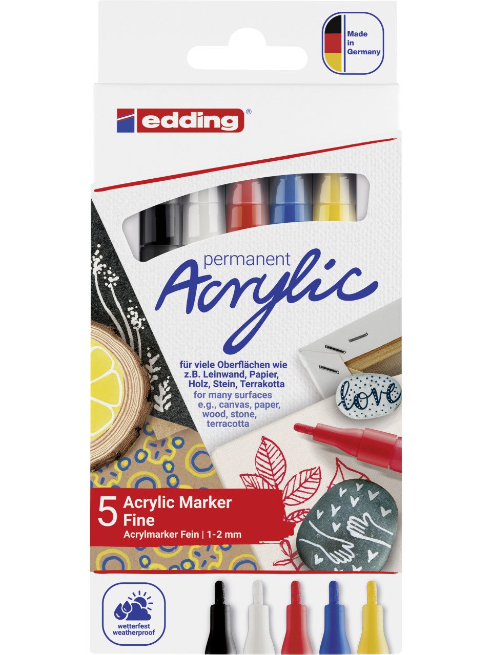 Produktdetails: Set mit Acrylmalstiften mit feiner Spitze zur Verwendung auf verschiedenen Oberflächen wie Leinwand, Papier, Holz, Stein und Terrakotta | das Set enthält die Farben schwarz, verkehrsrot, enzianblau, verkehrsweiß und sonnengelb | Acrylmarker in Premiumqualität, wasserfeste, pigmentierte Tinte auf Wasserbasis | undurchsichtig, lichtecht und dauerhaft; für eine saubere Anwendung und ein mattes Finish | die robuste, feine Rundspitze eignet sich für müheloses Zeichnen von Konturen oder Details | Ersatzspitzen sind erhältlich | Auswahl aus 20 leuchtenden Farben |