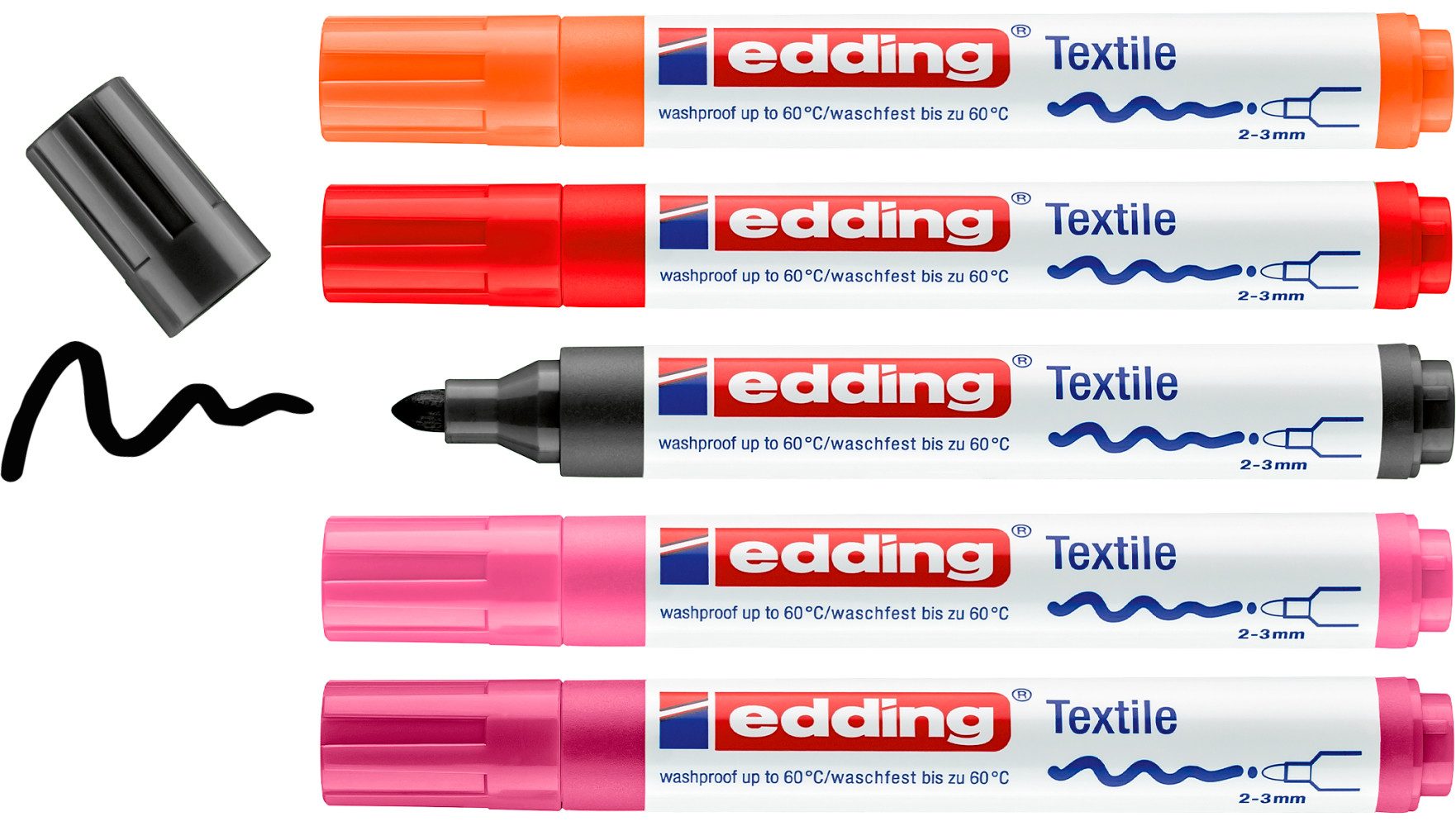 Die edding Textilmarker, 5 Stück, gibt es in 3 Farbkombinationen. Eine Fixierung wird durch Bügeln (ohne Dampf) erreicht. Die Stifte sind mit einer Rundspitze ausgestattet die eine Strichbreite von 2-3 mm hat. Die Pigmenttinte ist auf Wasserbasis, geruchsneutral, schnelltrocknend und sehr lichtbeständig. Waschbarkeit bis zu 60°C.