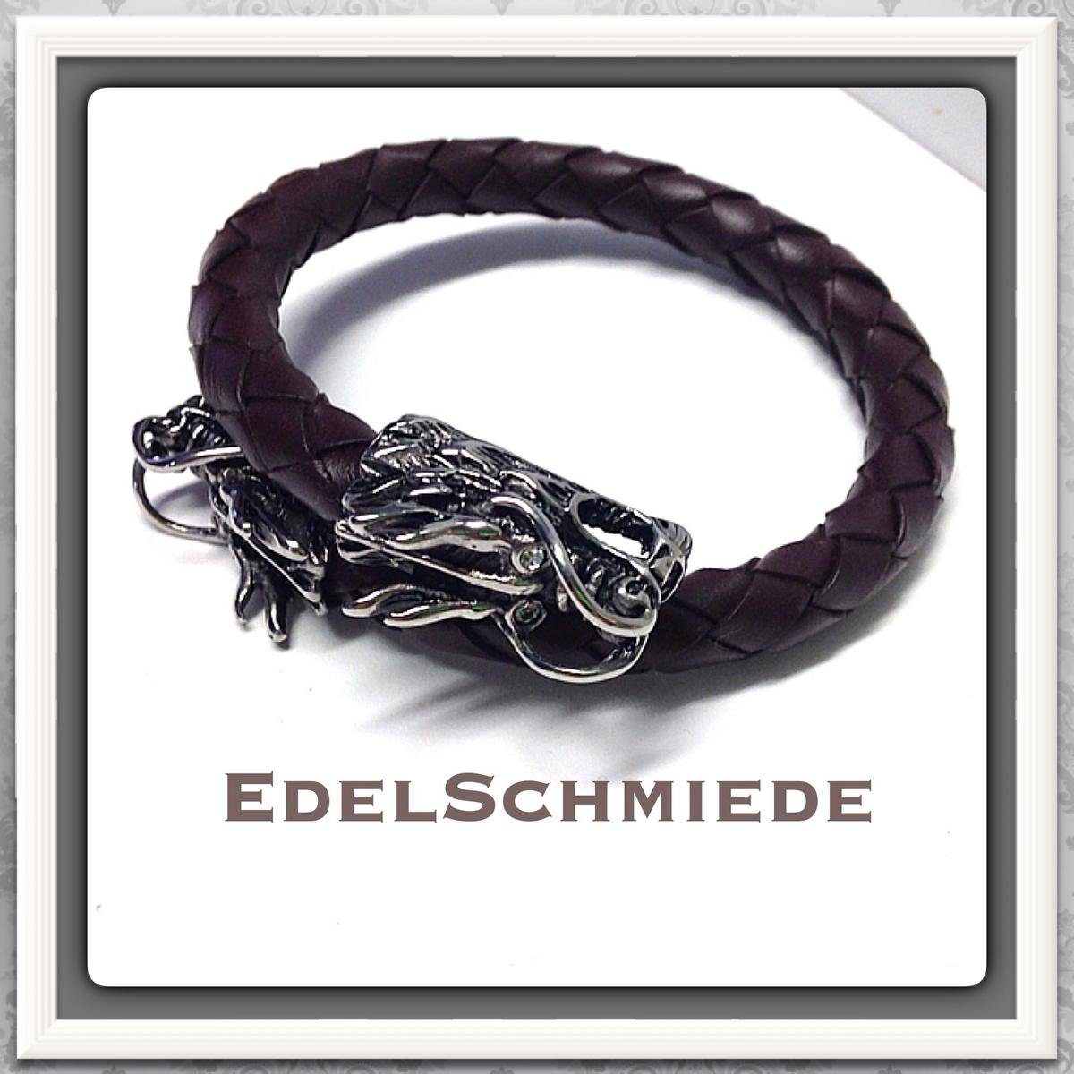 Dieser ausgefallene Armschmuck besteht aus zwei Drachenköpfen, die aus Edelstahl gefertigt sind. Daran befestigt ist braunem, geflochtenes lederband. Der Armschmuck wirkt modern und rustikal und fällt am Arm schon auf. Für jeden Träger, der zu seinem Schmuck steht - ein echtes Highlight.