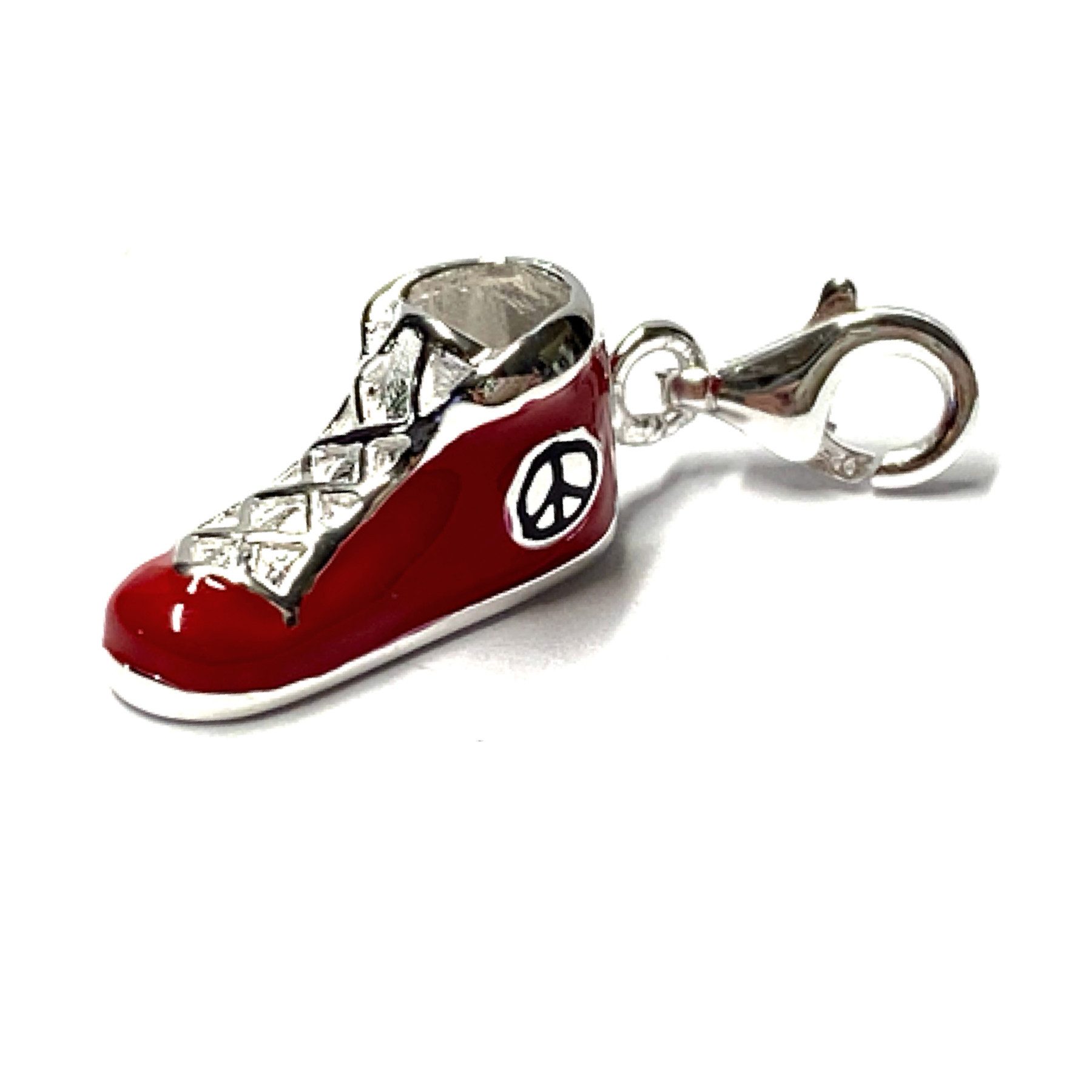 Dieser witzige Anhänger ist aus 925/- Sterling Silber gefertigt und wurde abschließend mit Farblacken veredelt. Gezeigt wird ein roter Sportschuh mit seitlich geprägtem Peace Zeichen.