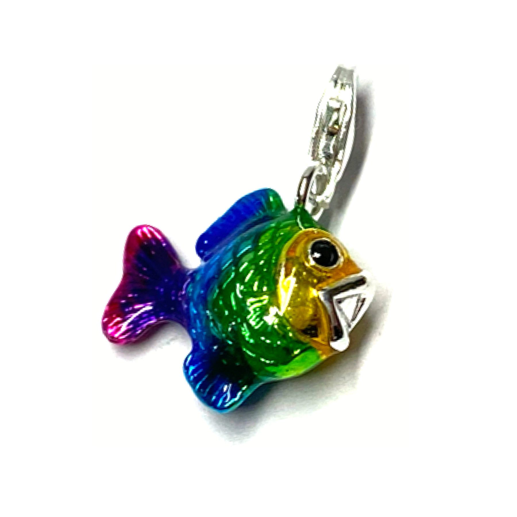 Dieser witzige Anhänger ist aus 925/- Sterling Silber gefertigt und wurde abschließend mit Farblacken veredelt. Gezeigt wird ein farbenfroher Fisch mit bunten Elementen.