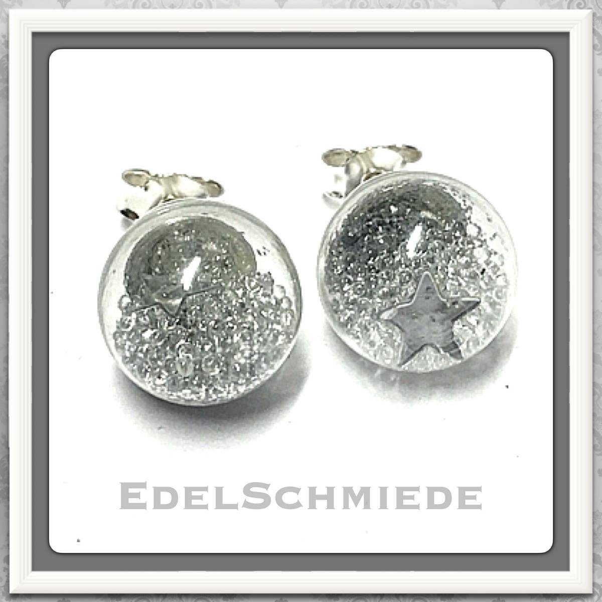Diese ausgefallenen Ohrringe sind aus 925/- Sterling Silber gefertigt und haben eine gefüllte Glashohlperle aufgesetzt. Darin befinden sich winzig kleine klare Glasperlen und zusätzlich jeweils ein silberfarbiger Stern als Pailette.