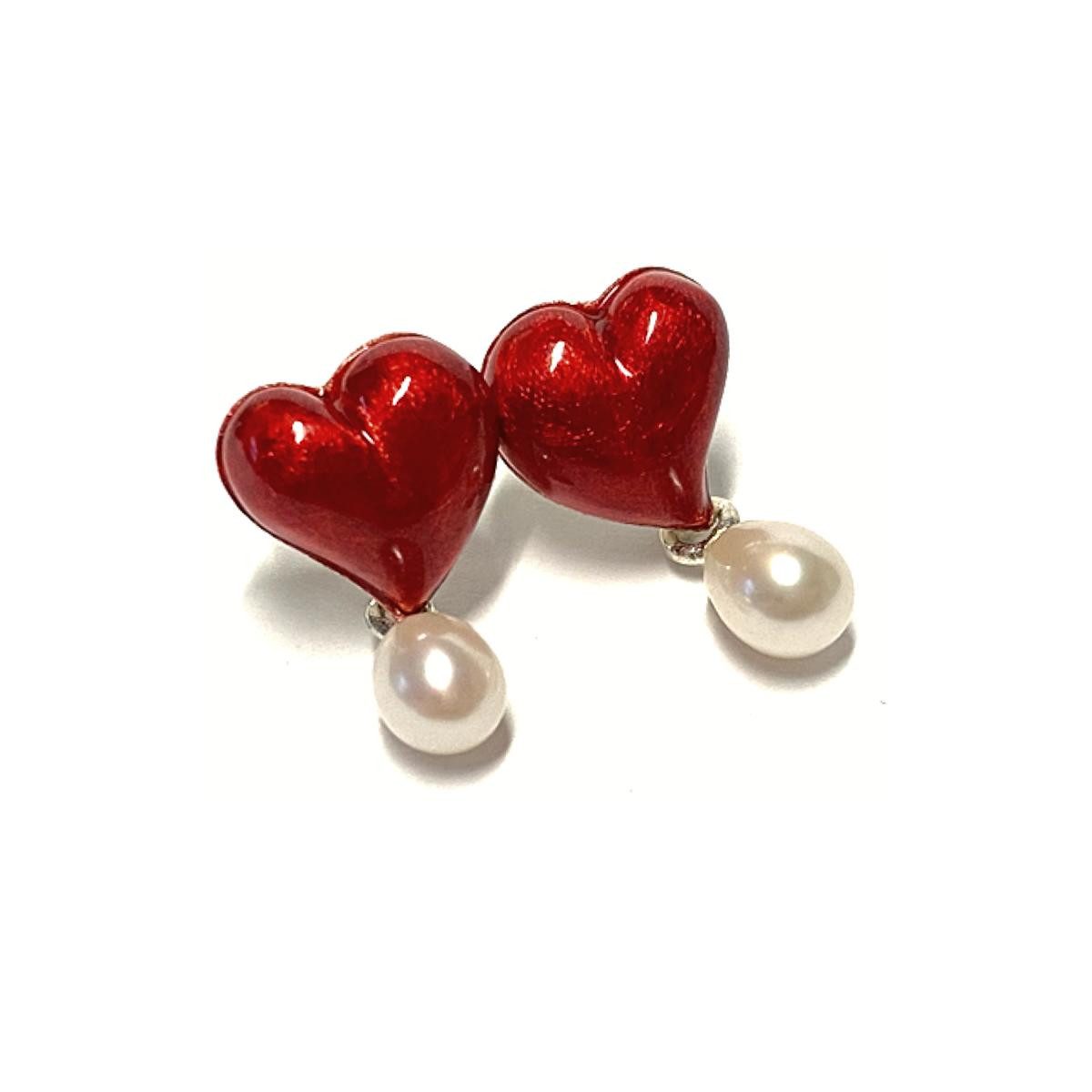 Diese tollen Ohrringe sind aus 925/- Sterling Silber gefertigt und wurden in ihrer Oberfläche komplett poliert. Dargestellt ist eine geschlossene und gewölbte Herzform, die aufgefüllt mit roten LackEmail zum absoluten Hingucker wird. Die Besonderheit hierbei sind die beweglich angebrachten Perlen.