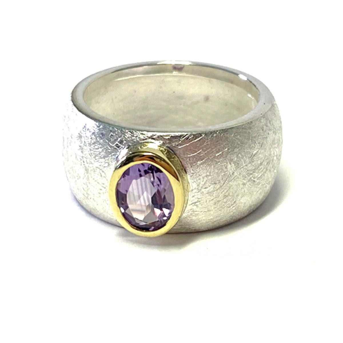 Dieser edle Fingerring ist aus 925/- Sterling Silber gefertigt und wurde abschließend, als Anlaufschutz, rhodiniert. Die breite und gewölbte Oberfläche ist komplett eismattiert und gibt somit eine sehr interessante Oberflächenstruktur her. Darauf aufgesetzt befindet sich eine ovale und vergoldete Zargenfassung, die einen facettierten Amethyst sicher hält. Die Schiene verläuft ringsum gleich breit.