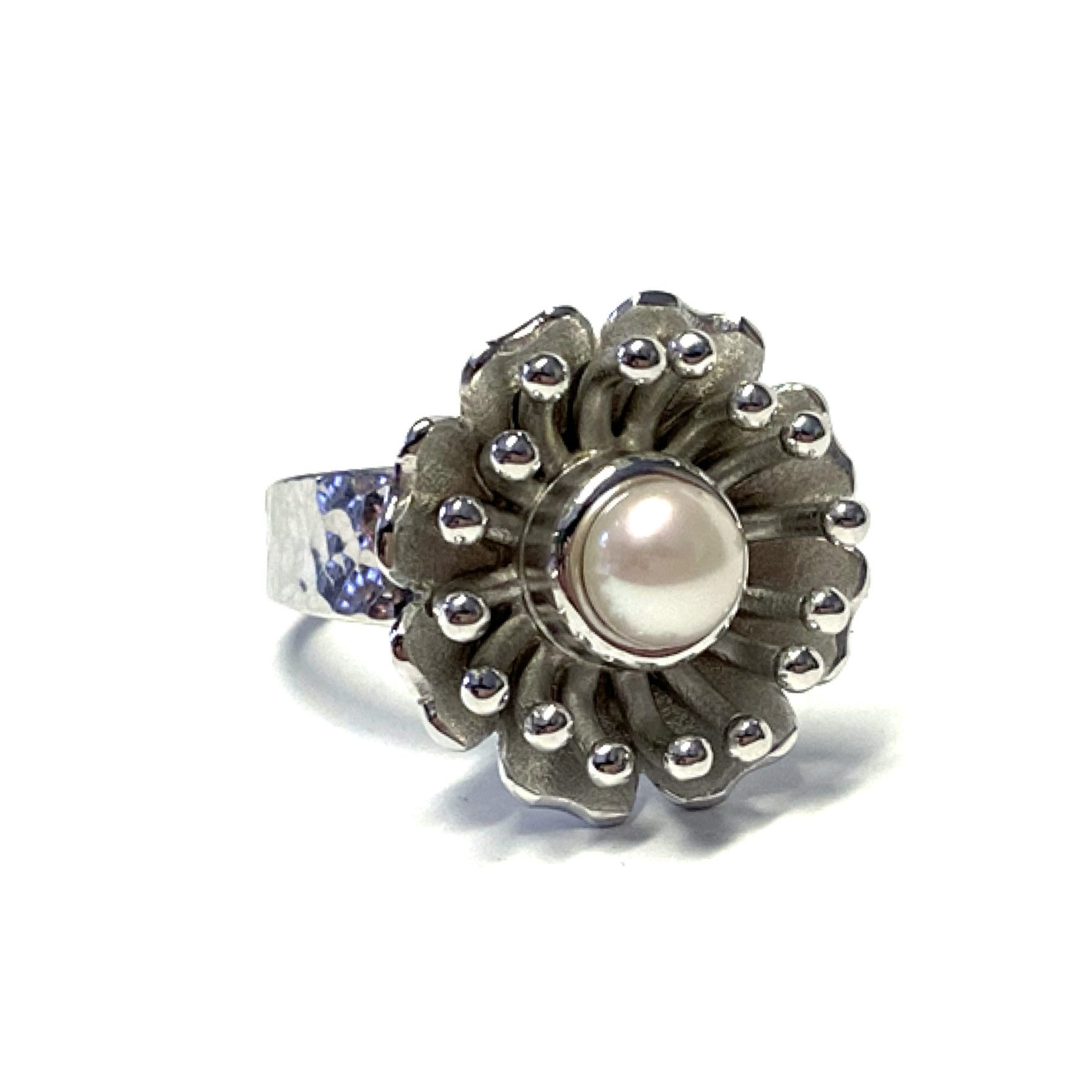 Dieser einzigarige Fingerring ist aus 925/- Sterling Silber gefertigt. In einem Kranz aus feinen Stegen sitzt mittig eine herrlich weiße Perle. Die Oberfläche des Ringes ist hauptsächlich poliert, lediglich im Ringkopf finden sich dezente matte Stellen.