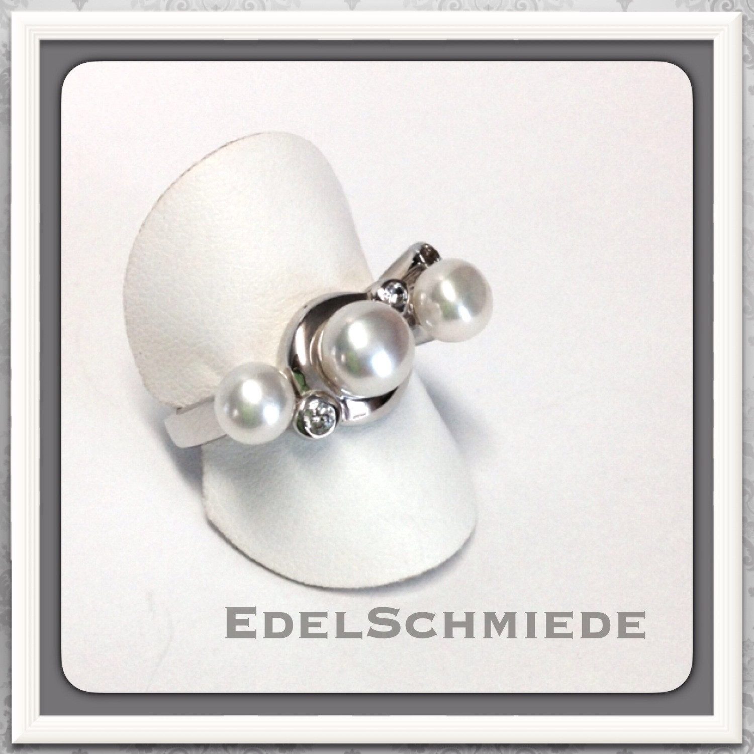 Die Perlen sind unterschiedlich groß und die Zirkonias sind auch nicht in einer einheitlichen Größe. Durch diese Asymmetrie wirkt der Ring sehr interessant und abwechslungsreich.