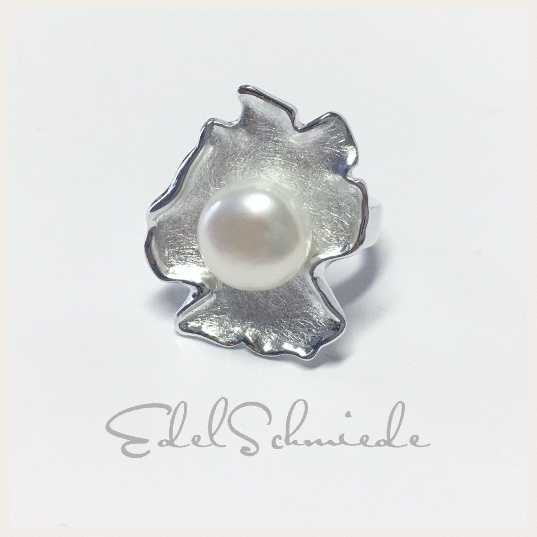 Dieser elegante Fingerring ist aus 925/- Sterling Silber gefertigt und hat in seinem Ringkopf eine echter weiße Perle sicher aufgesetzt. Dieser Ringkopf erinnert an eine Blütenform, kann aber auch als Deustchland Umriß asoziiert werden.
