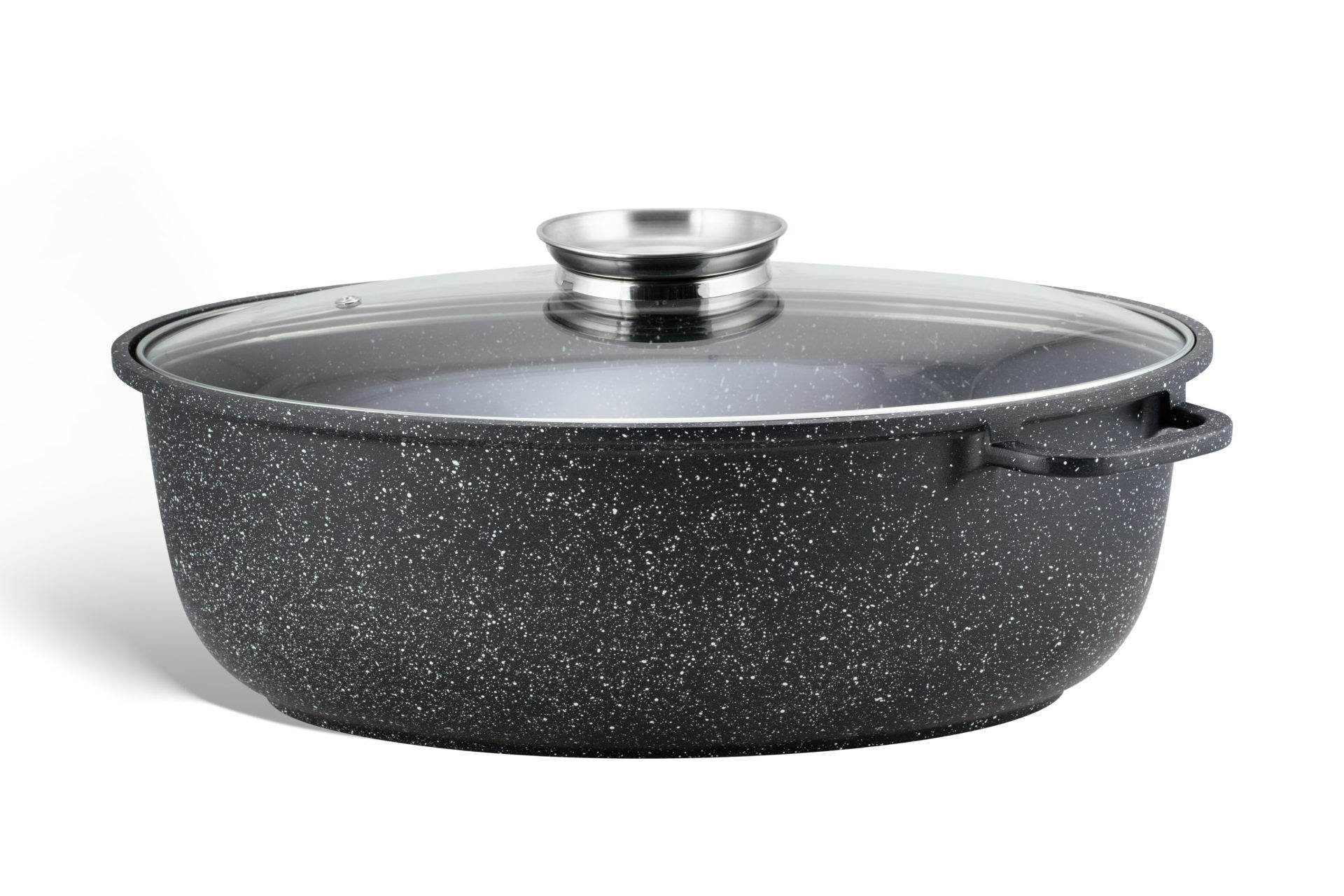 Dieser hochwertige Bräter aus Aluminium-Druckguss ist die perfekte Wahl für festliche Gerichte wie Gans oder Ente sowie für viele weitere Fleisch- und Schmorgerichte. Mit einem Durchmesser von 38 cm und einem Fassungsvermögen von 8,0 Litern bietet er ausreichend Platz für große Mahlzeiten. Die robuste, marmorierte Antihaftbeschichtung sorgt für einfache Handhabung und mühelose Reinigung, während die gehärteten Glasdeckel und der multifunktionale Pfannendeckel volle Kontrolle beim Kochen ermöglichen. Für alle Herdarten geeignet, inklusive Induktion, überzeugt dieser Bräter durch Langlebigkeit, Vielseitigkeit und exzellente Wärmeverteilung – ein unverzichtbares Küchenwerkzeug für jede Gelegenheit.