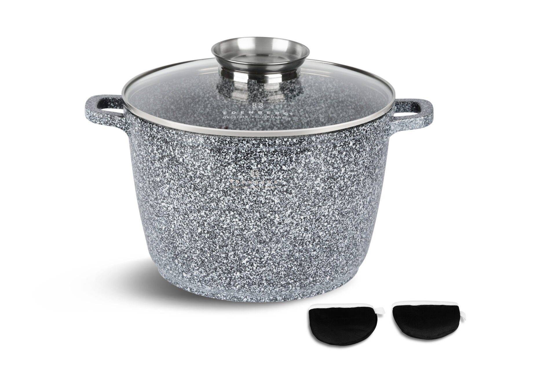 Eigenschaften | Material: Hochwertiges, gepresstes Aluminium mit langlebiger Marmorbeschichtung Antihaftbeschichtung: Ideal für fettarmes, gesundes Kochen und einfache Reinigung Boden: 9-lagiger Mehrschichtboden – schnelle Wärmeaufnahme, gleichmäßige Verteilung und langanhaltende Wärmespeicherung Für alle Herdarten geeignet: Gas, Elektro, Halogen, Ceran und Induktion Griffe: Robuste Metallgriffe – hitzebeständig, mitgeliefert: 2 Schutzkappen für sicheres Anfassen Pflegeleicht und kratzfest – auch bei häufigem Gebrauch Modernes Design: Stilvolle Optik, passend für jede Küche |