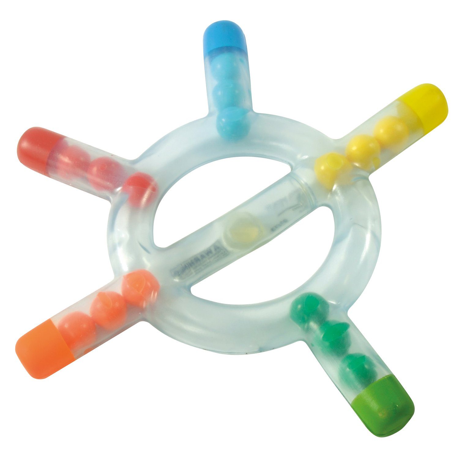 ... das ist gar nicht so einfach, die Kugeln in sechs verschiedenen Farben durch Drücken auf die Silikonform in das gleichfarbige Endstück zu steuern - denn die anderen Kugeln reagieren auch auf die Verformung. Das Fühlrad kann gut am Griff in der Mitte oder an den einzelnen Enden festgehalten werden. Fördert die Konzentration und die Auge-Hand-Koordination.
