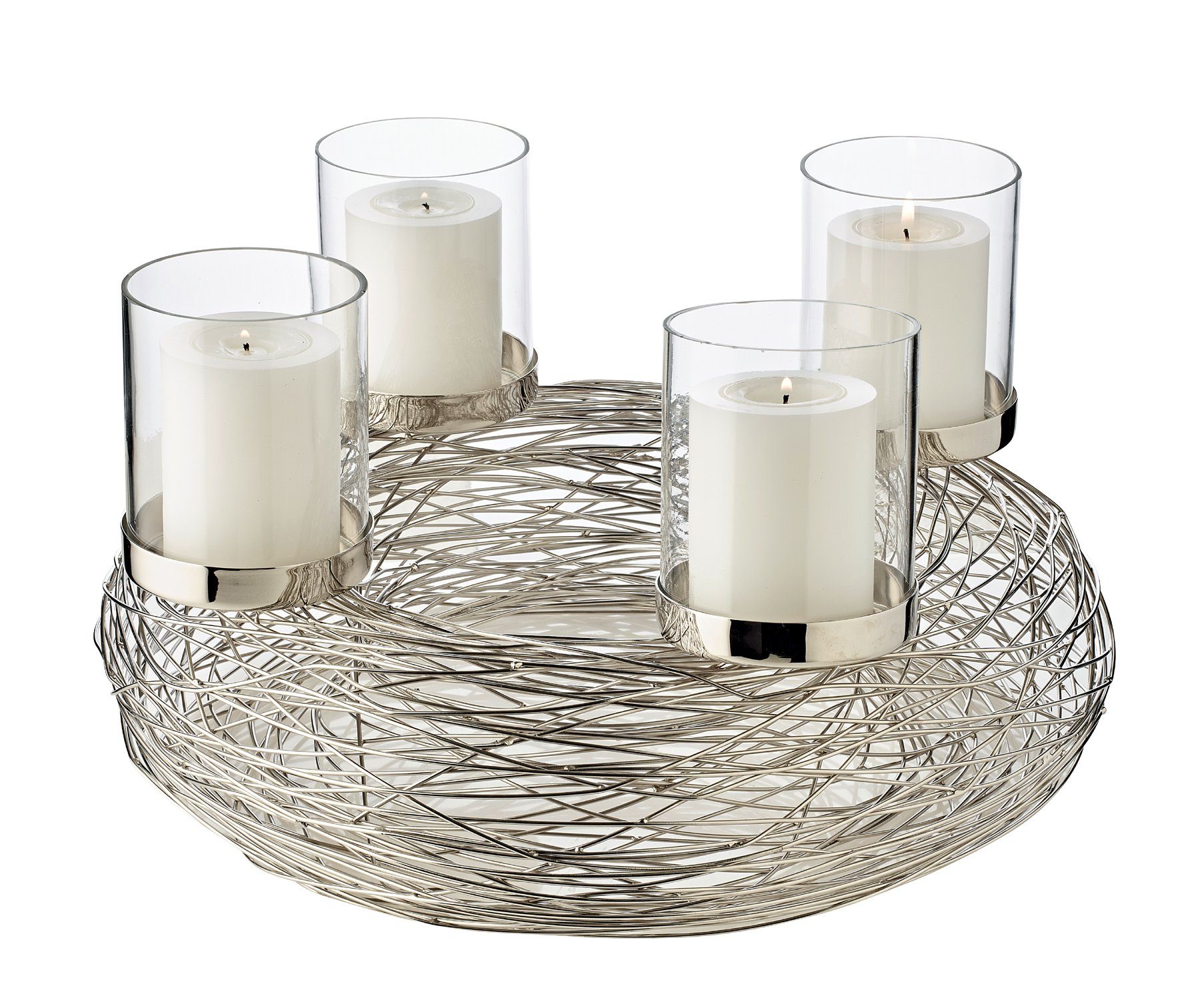 IHRE VORTEILE: Adventskranz mit edler Silber-Optik glänzend Edelstahl langlebig sicheres Abbrennen der Kerze für handelsübliche Stumpenkerzen für Kerzen mit einem ø von 6-7 cm ø 36 cm 20 cm hoch vielseitig kombinierbar mit Kerzengläsern