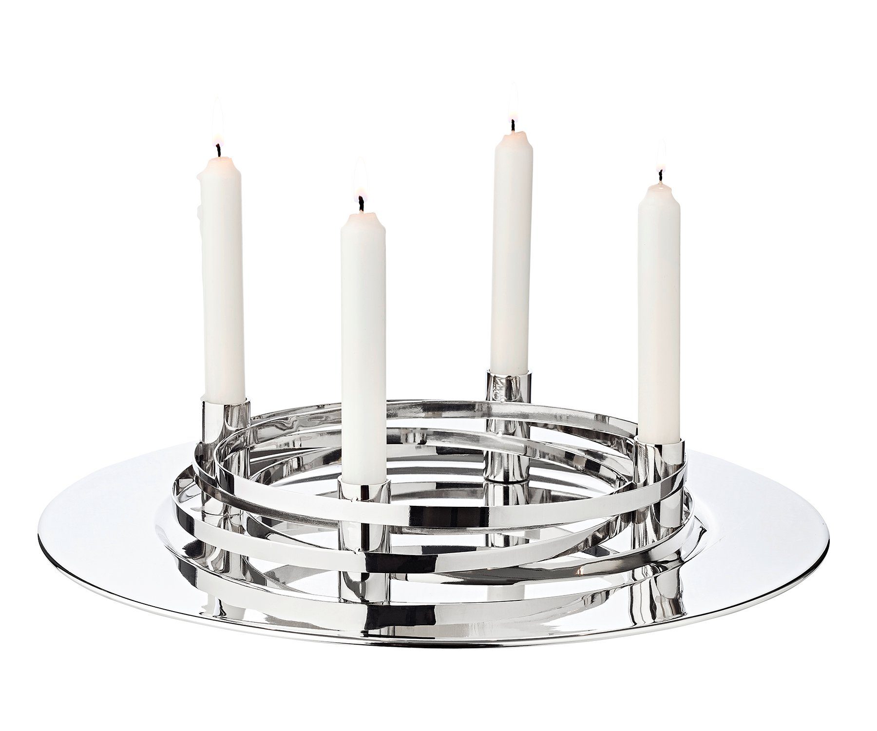 IHRE VORTEILE: Adventskranz Avia mit edler Silber-Optik glänzend Edelstahl langlebig sicheres Abbrennen der Kerze für handelsübliche Stabkerzen für Kerzen mit einem ø von 2 cm ø 29 cm 6 cm hoch vielseitig kombinierbar