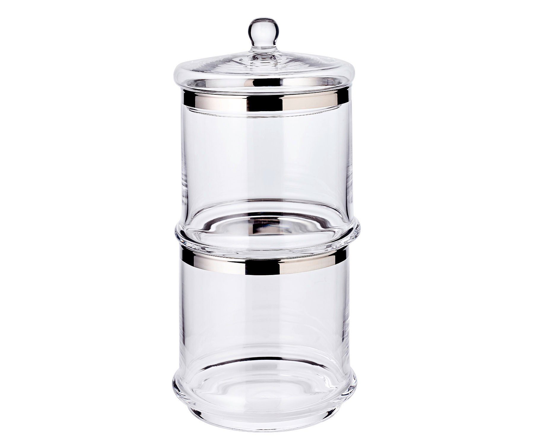 IHRE VORTEILE: 3 Etagen Behälter für Ihre Vorräte Höhe 29 cm, Ø 13 cm Mundgeblasenes Kristallglas Mit einem Platinrand veredelt Handarbeit Stapelbar Nicht spülmaschinengeeignet