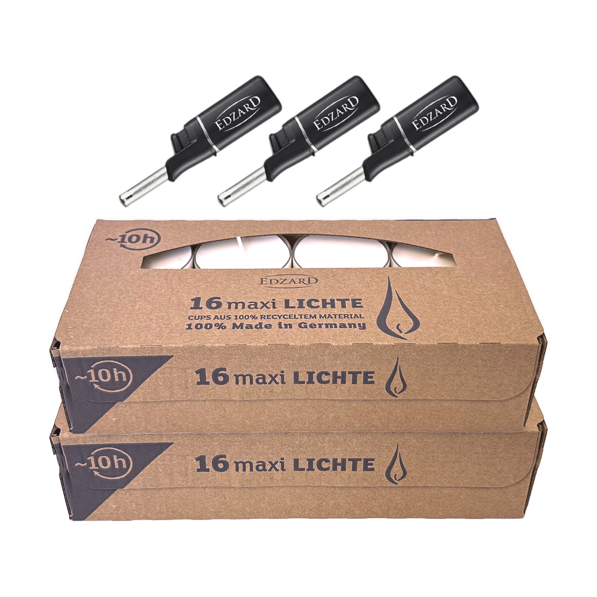 VORTEILE: Brenndauer ca. 10 Stunden Made in Germany 32 Stück + 3 Feuerzeuge Vorteilspreis Wachsfarbe weiß Transparente Hülle